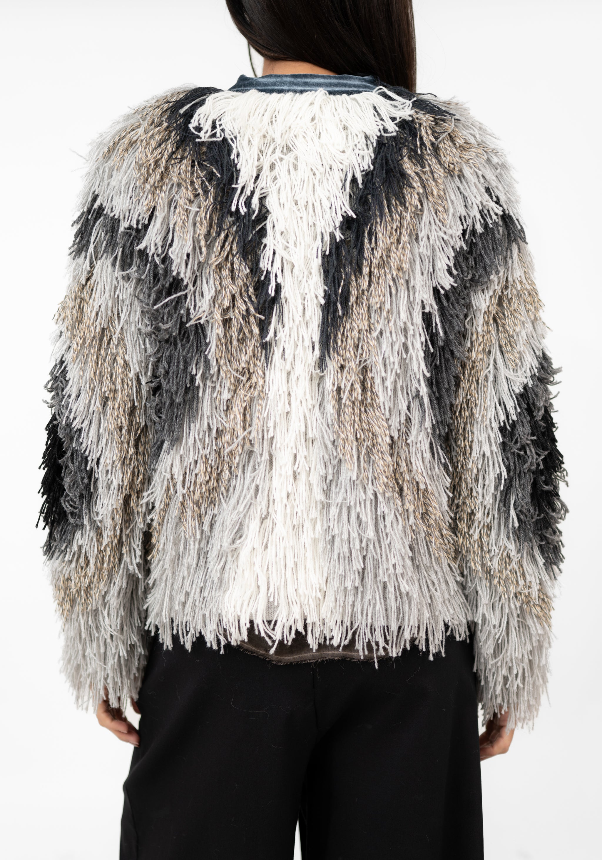 The Butterfly Wing Tones Fringed Jacket from Peru-based Alessandra Petersen is crafted from soft alpaca and finished with a velvet collar for a sense of movement and refined texture. Designed for those drawn to effortless sophistication and artisanal craftsmanship, it brings a sense of ease and fluidity. An effortless layer for everyday looks, it also brings refined edge when styled for nights out. Style it with wide-leg pants or flowing skirts to highlight its graceful drape and tactile allure.
