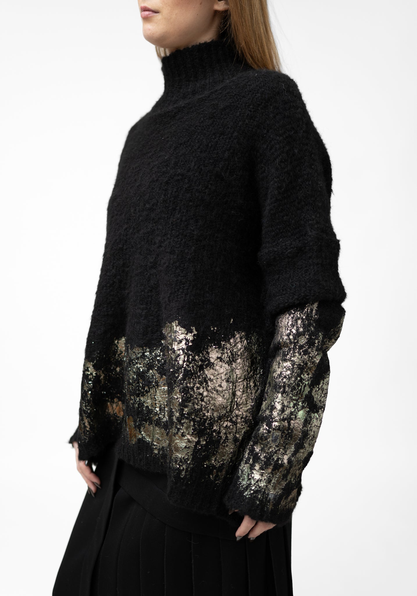 The Black Alpaca Oilslick Foiled Knit Sweater from Melbourne-based Amano blends soft alpaca with a turtle neck and subtle foiled hem for contemporary elegance. Designed for those who appreciate cozy yet striking pieces, it adds texture and visual interest to any outfit. Style it with wide-leg trousers or a midi skirt to highlight the foiled detail and create a modern, layered ensemble.