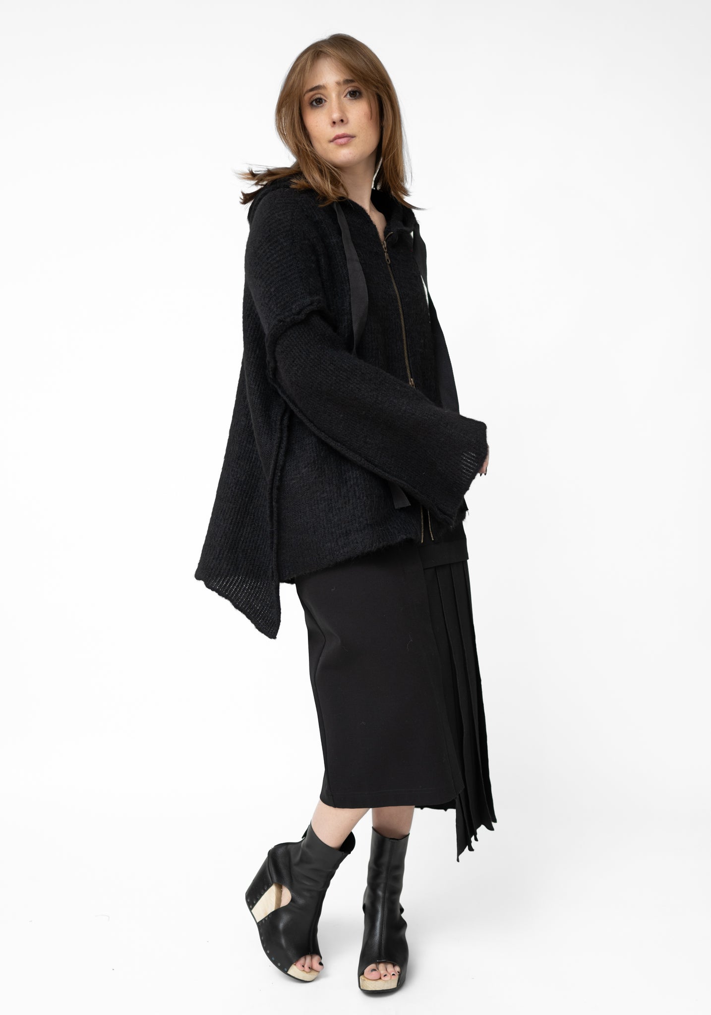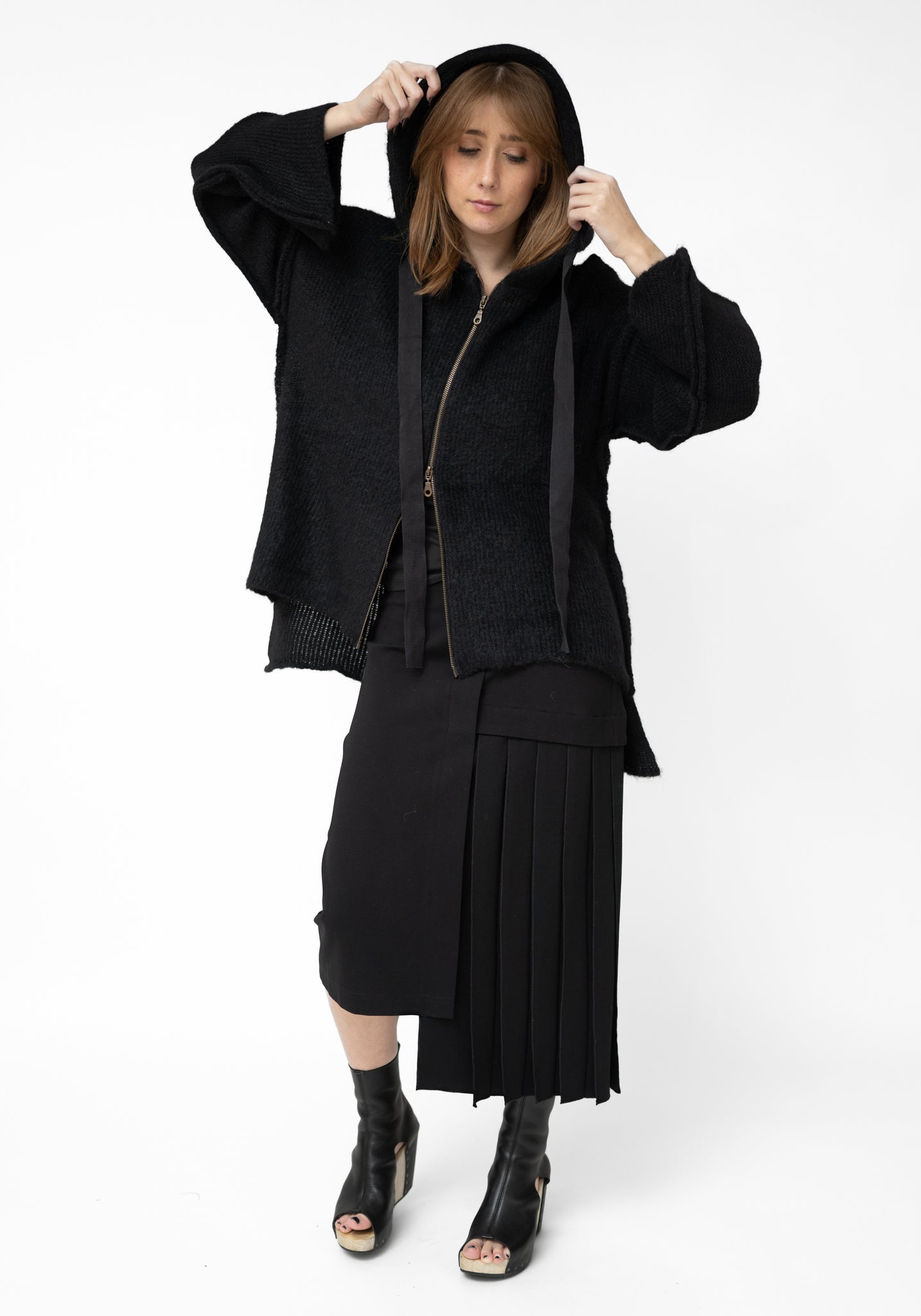 The Black Alpaca Oversized Zip Front Hoodie from Melbourne-based Amano features a boxy, relaxed fit with a hood, two-way zip, and subtle external seams for sculptural interest. Its asymmetric hem adds movement and dimension. Made for those who embrace elevated, expressive style, it is an effortless layer for everyday looks, and also brings refined edge when styled for nights out. Pair with fitted tops, wide-leg pants, or dresses to highlight its architectural silhouette and cozy alpaca texture.