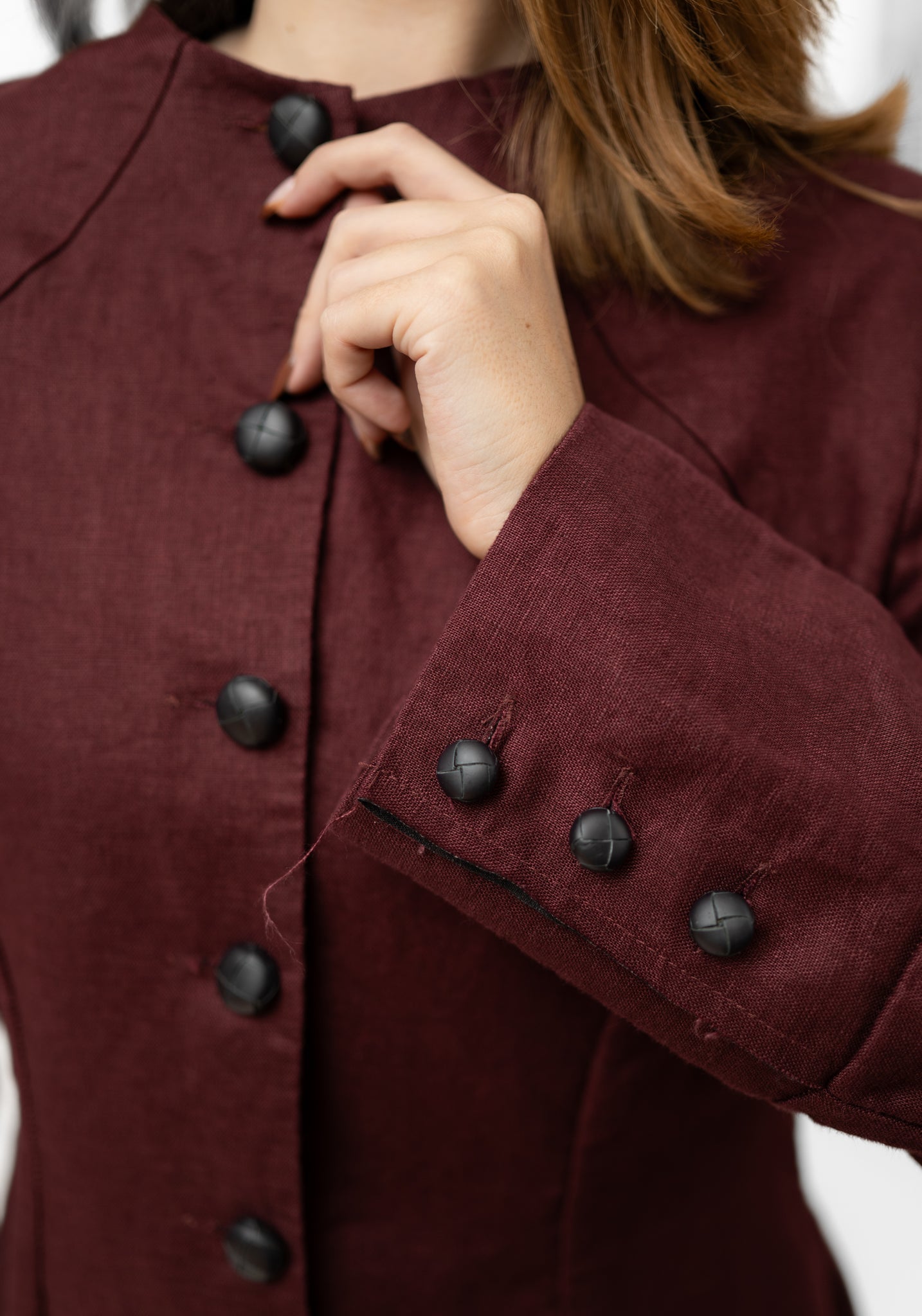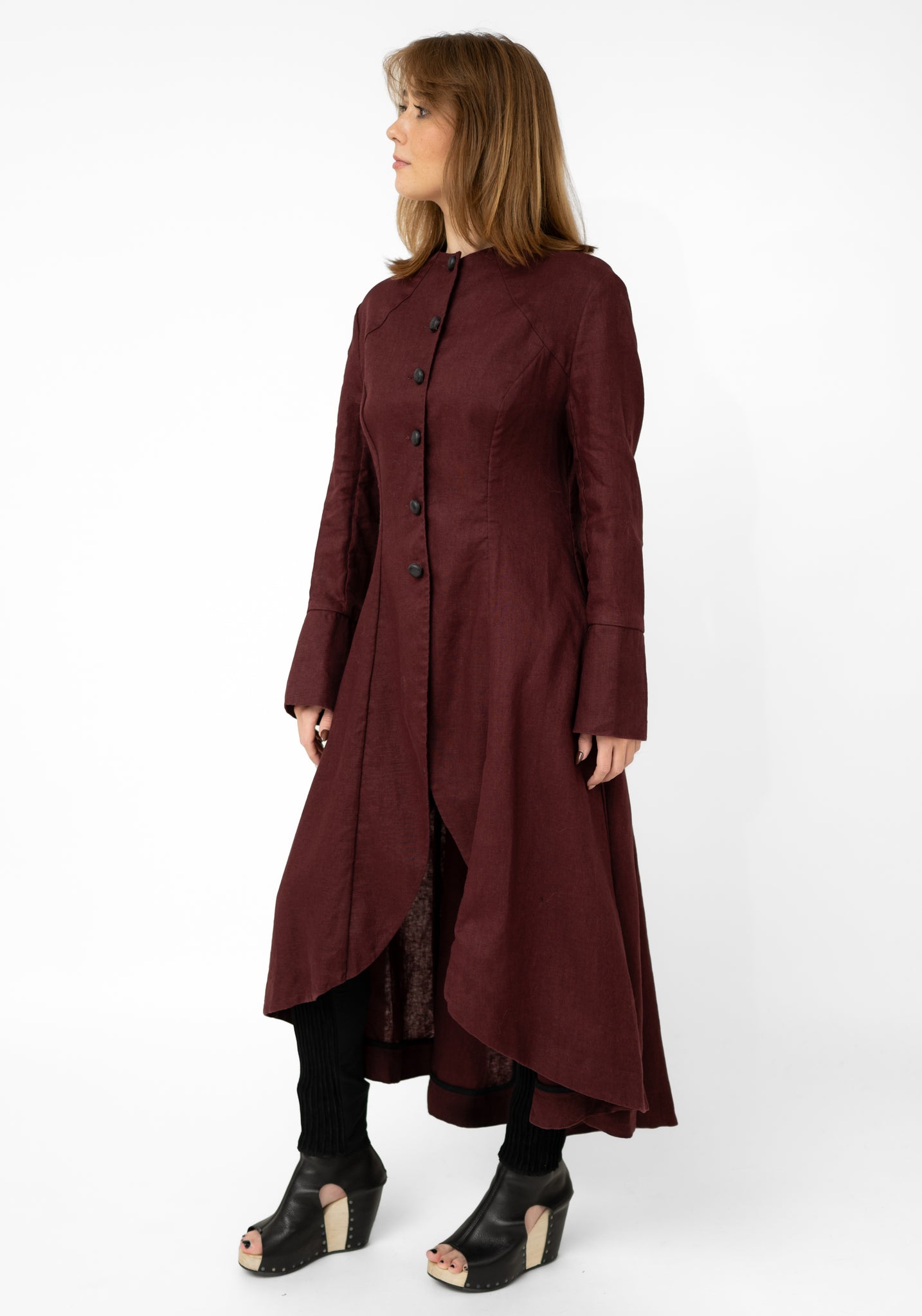 The Burgundy Linen Tuxedo Maxi Coat from Melbourne-based Amano features a tailored fit with a nipped waist that exudes effortless romance. Made for those who embrace elevated, expressive style, its rich color and sculptural silhouette bring dimension to casual outfits while offering sophistication for after-dark gatherings. Layer it over a full skirt and pair with a standout leather bag to showcase its architectural presence.