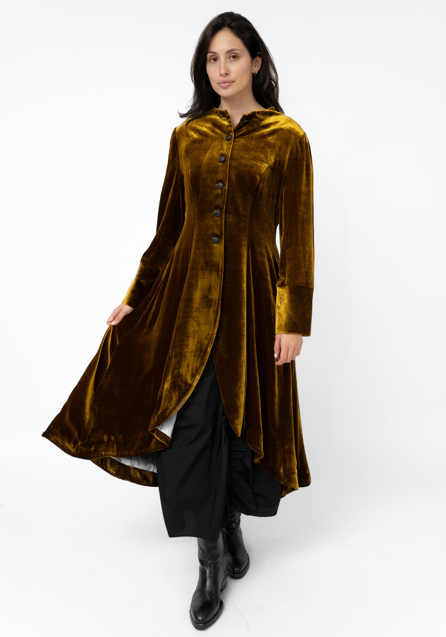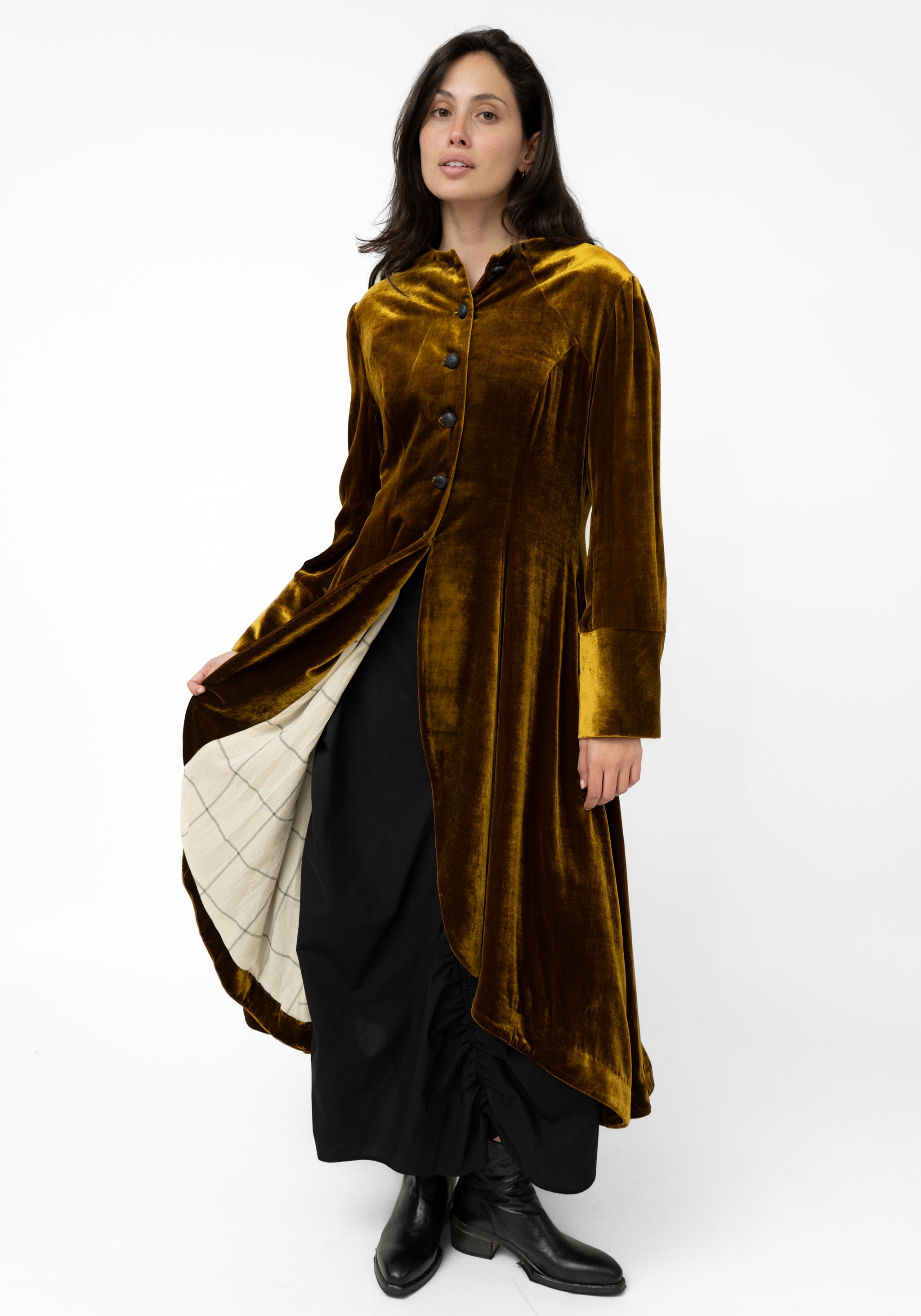 The Gold Silk Velvet Tuxedo Maxi Coat from Melbourne-based Amano features a tailored silhouette with a nipped waist and paneled construction for sculptural movement. Crafted for those who embrace refined statement pieces, it balances elegance with drama. Perfect for adding intrigue and dimension to daily wear, yet versatile enough to transition seamlessly into evening settings. Pair with a flowing neutral skirt or dress to highlight its flared shape and luxurious lining.