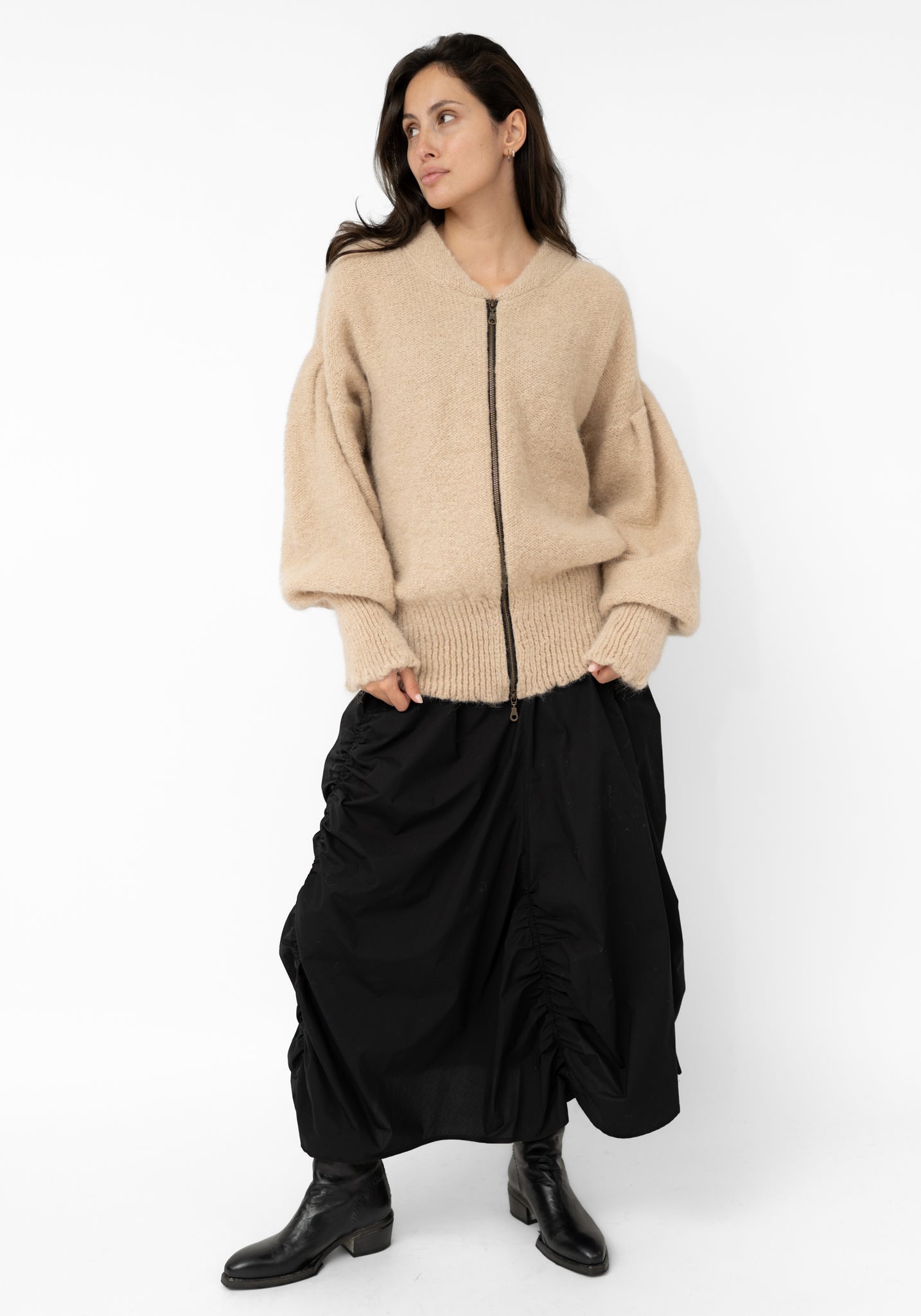 The Oat Alpaca Oversized Bomber Jacket from Melbourne-based Amano is made for those who appreciate elevated, cozy style with sculptural shape. Its textured alpaca construction offers warmth for colder months, while the voluminous silhouette is enhanced by fitted cuffs and hem. Perfect for layering over fitted tops, dresses, or everyday looks, yet refined enough to elevate evening ensembles.
