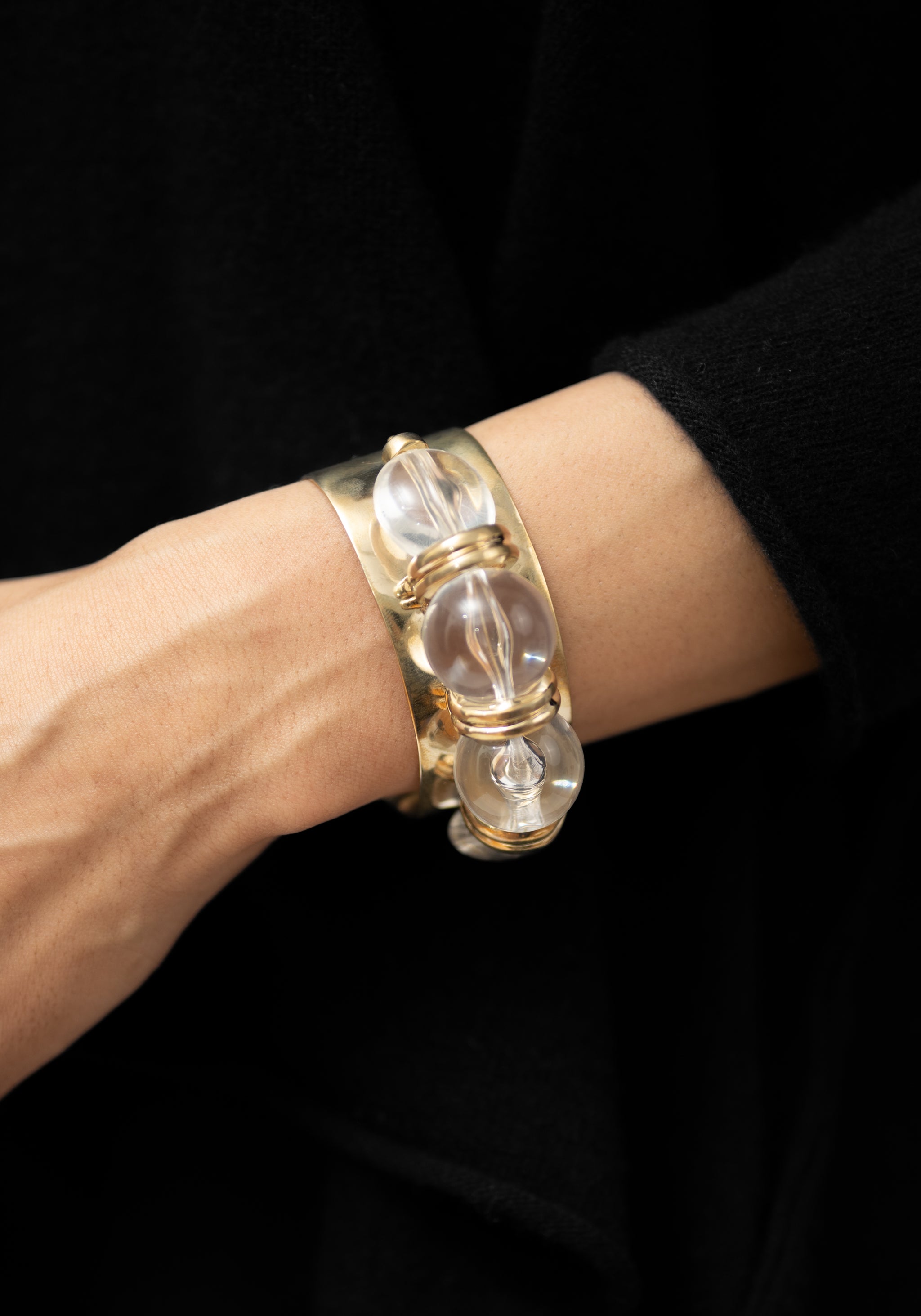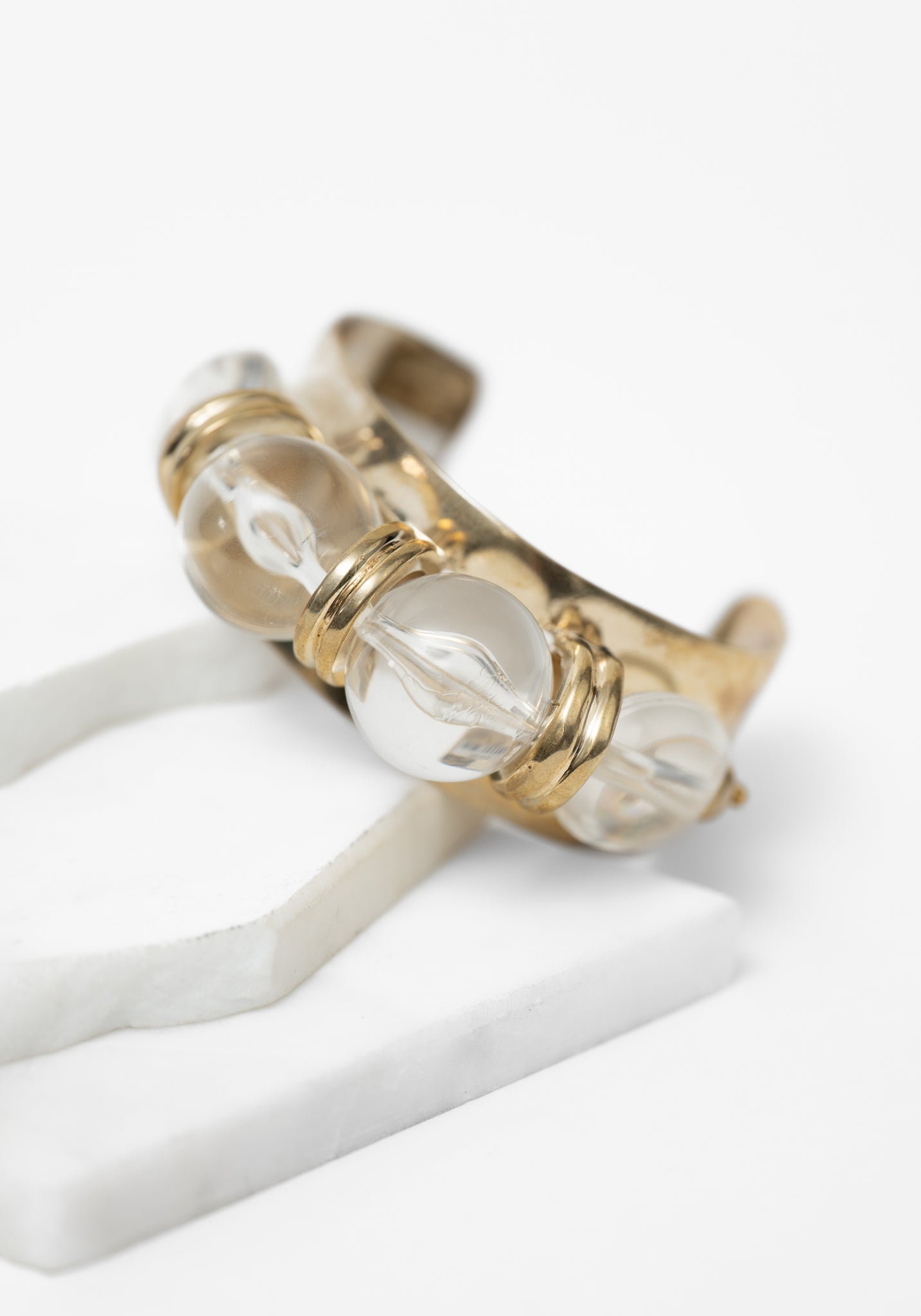The Brass and Vintage Acrylic Beads Trade Cuff from New York-based CASTLECLIFF is designed for those who embrace bold, ethically crafted jewelry and appreciate pieces that make a confident, personal statement. It can be worn alone as a standout accessory or stacked with other bracelets for a layered, textural effect.