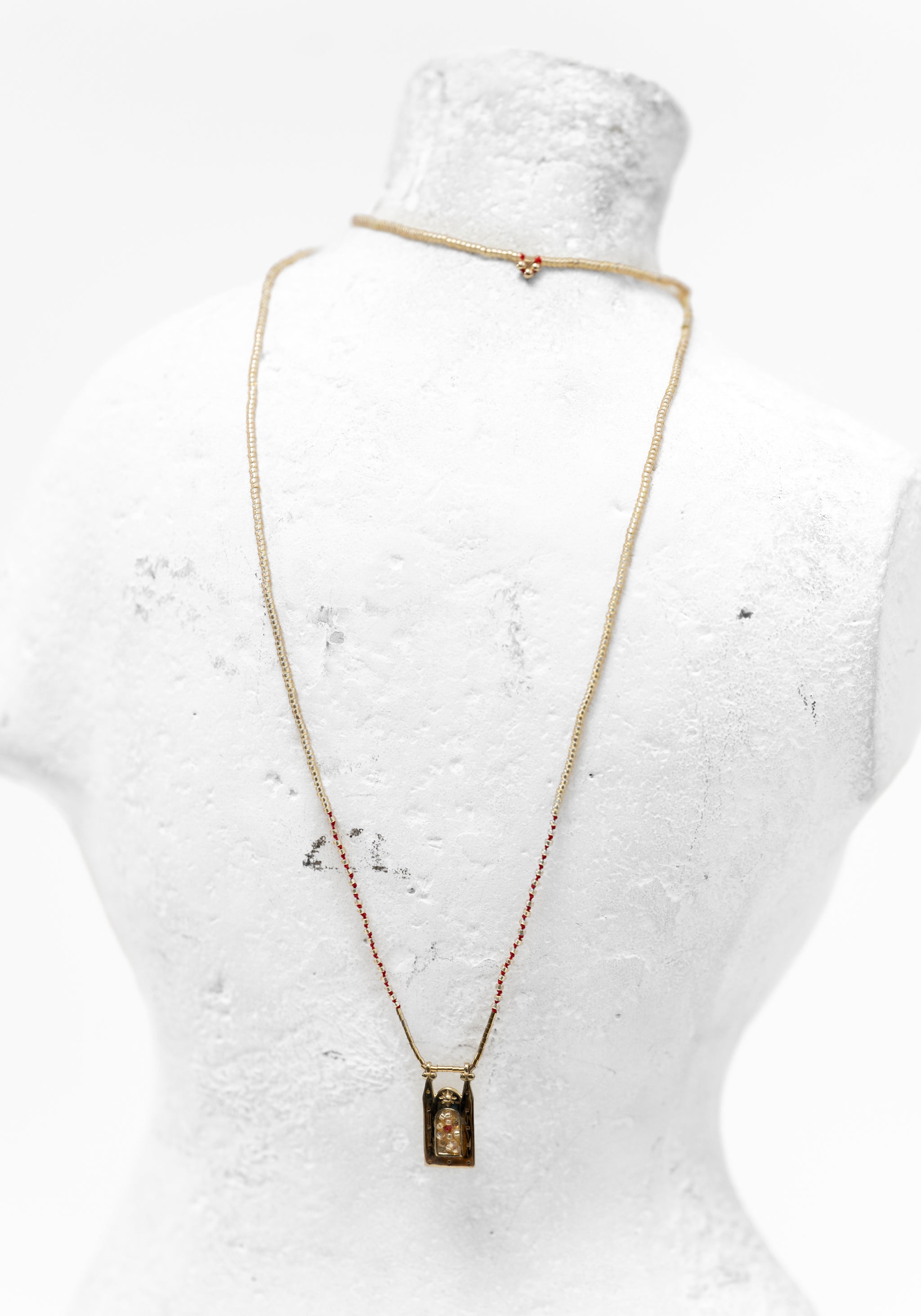 The Brass Phoenix Bead Filled Frame Necklace on Beads from Brooklyn-based Iwona Ludyga Design combines refined structure with artisinal charm through its brass frame and delicate beadwork. Designed for those who appreciate sophisticated yet playful jewelry, it works beautifully worn alone or layered to enhance a personalized, expressive stacking set.