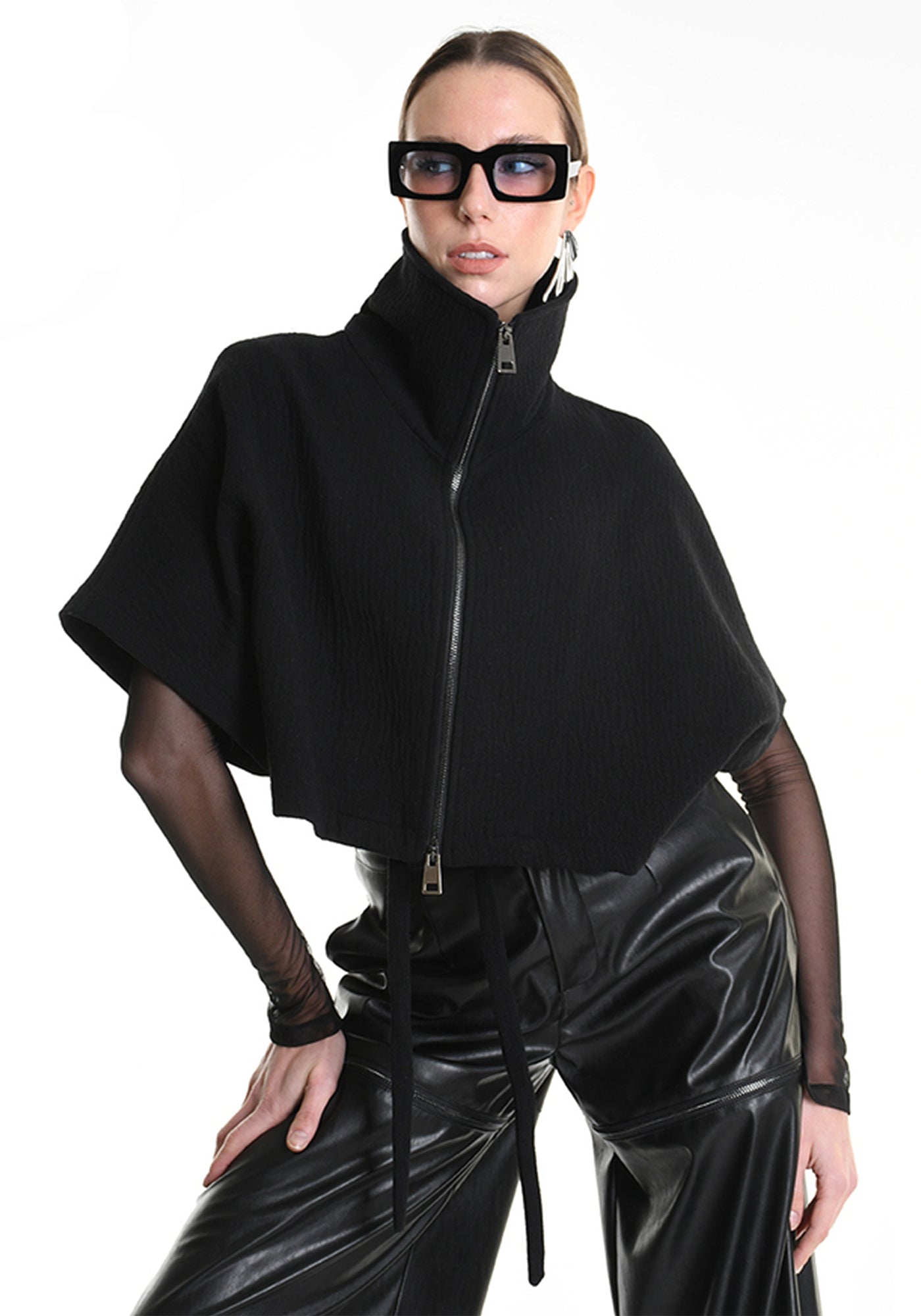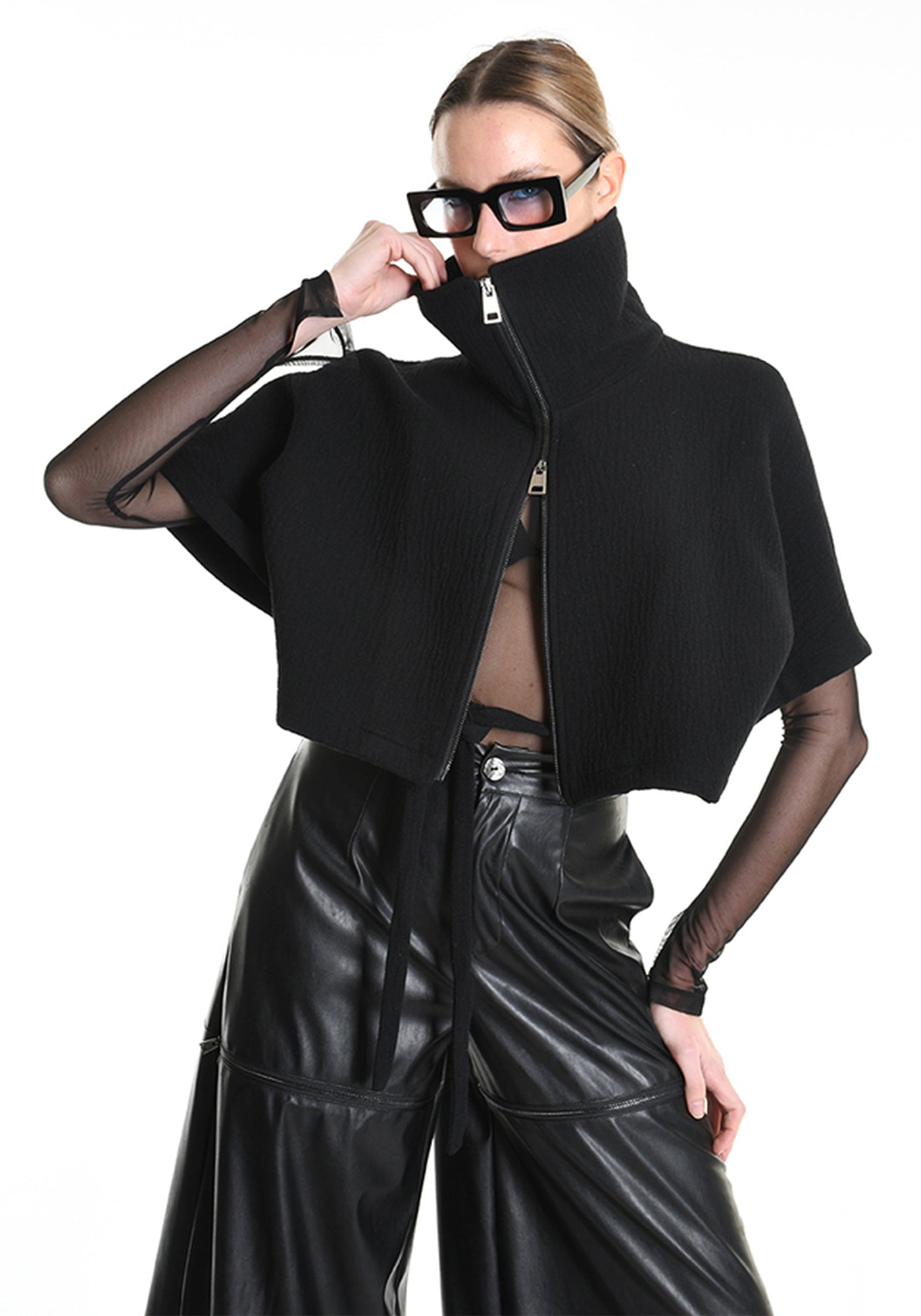 The Asymmetric Cropped Wool Blend Jacket from Italy-based La Haine is designed for those who embrace sculptural tailoring and statement layering. A versatile piece for everyday wear that easily elevates into more polished settings, its oversized boxy fit, high neck, and adjustable side ties create dynamic movement and bold structure. Pair with fitted pants, skirts, or layered pieces to showcase its striking, contemporary silhouette.