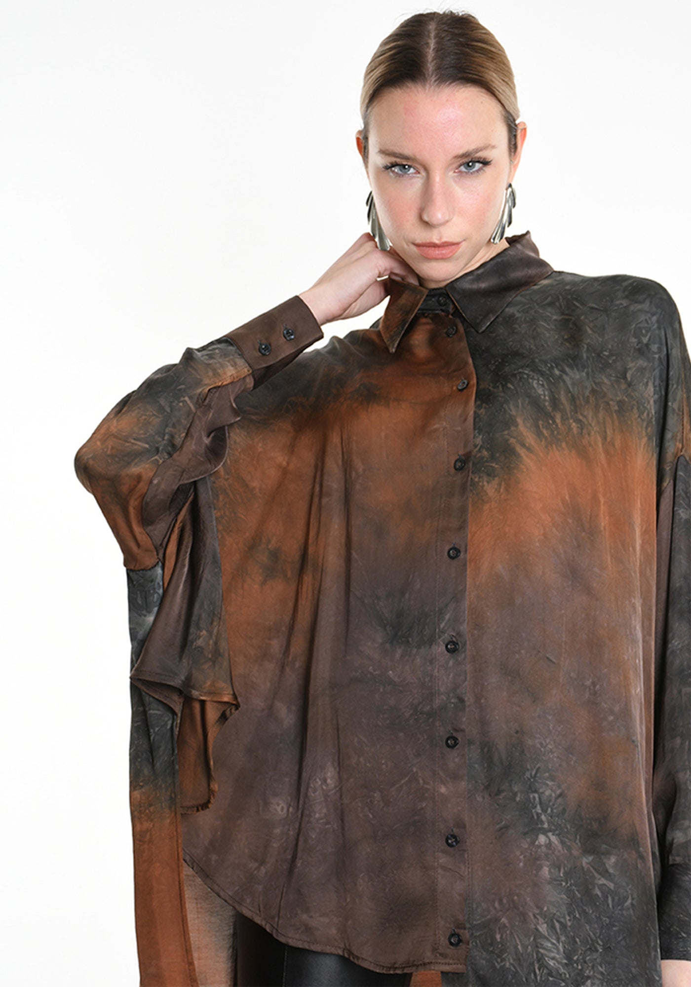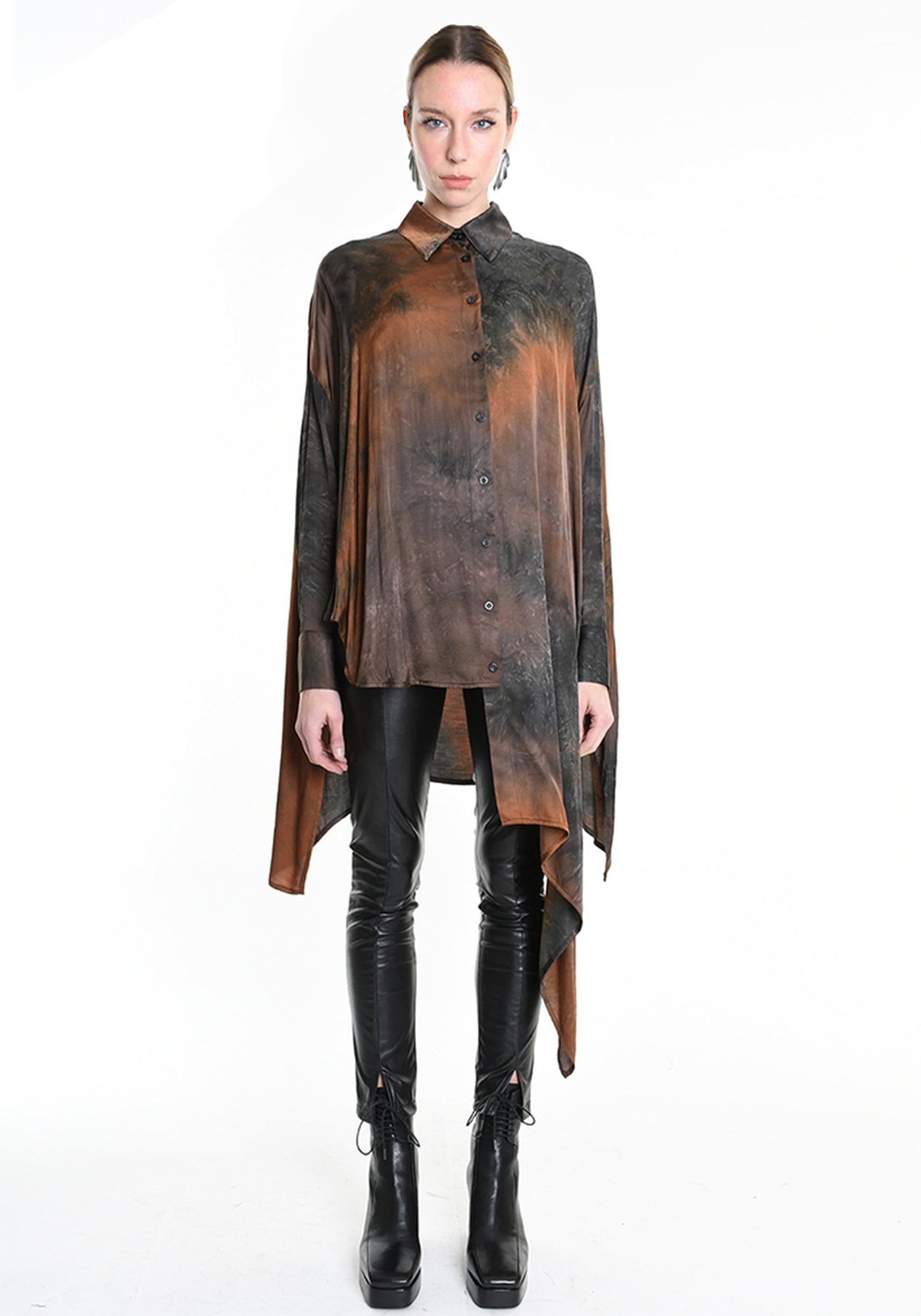 The Asymmetric Dyed Satin Tunic Blouse from Italy-based La Haine is designed for those who embrace sculptural, elevated wardrobe staples with fluid movement. An effortless layer for daytime wear that easily transitions into evening sophistication, its oversized drape, asymmetric hem, and optional sash create striking shape and dimension. Pair with tailored pants and statement jewelry to highlight its bold, contemporary silhouette.