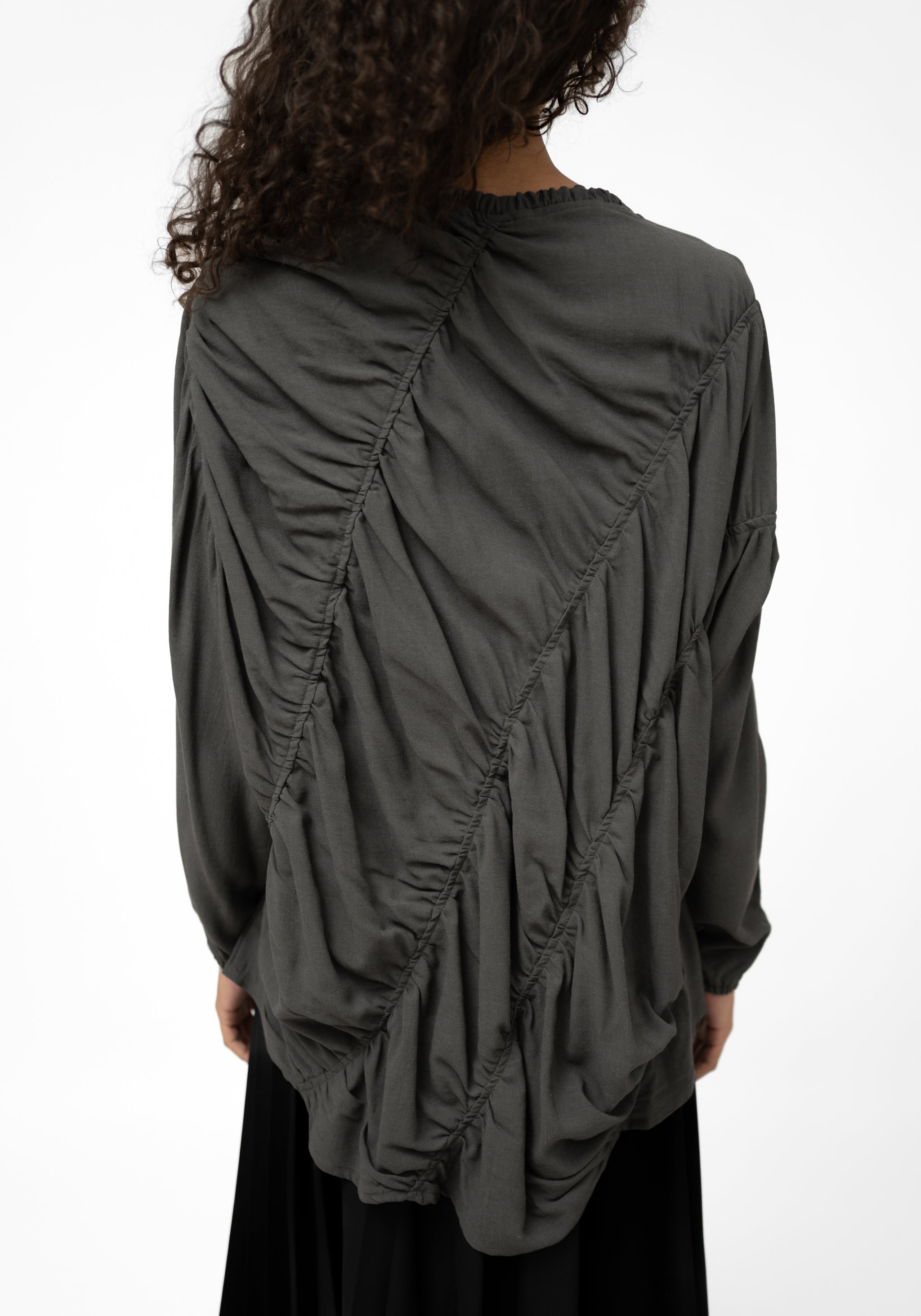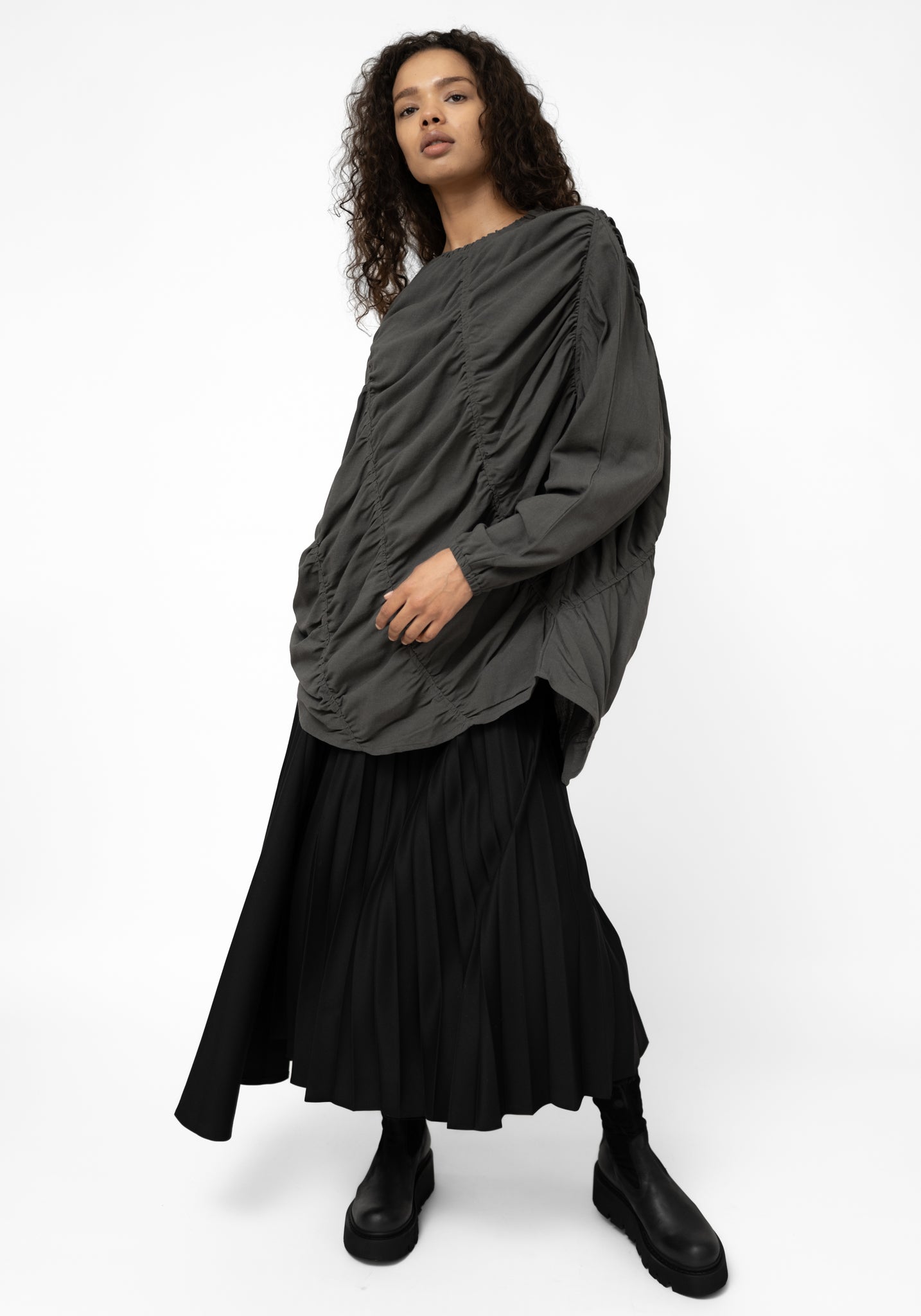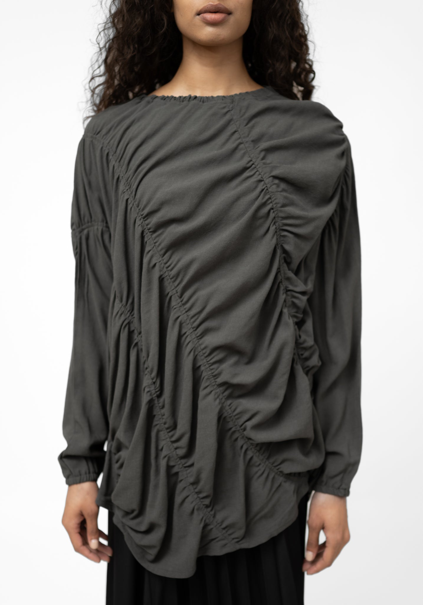 The Su Wool and Viscose Blend Ruche Detail Top from Greece-based La Vaca Loca is made for those who favor expressive, creative pieces that merge minimalist sensibility with bold shaping. Its voluminous, ruched silhouette can be styled with tailored pants for contemporary polish, layered under a structured jacket for contrast, or paired with skirts to create fluid, dimensional ensembles.