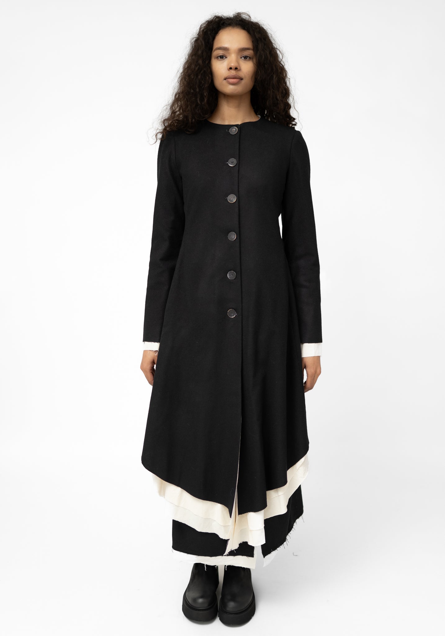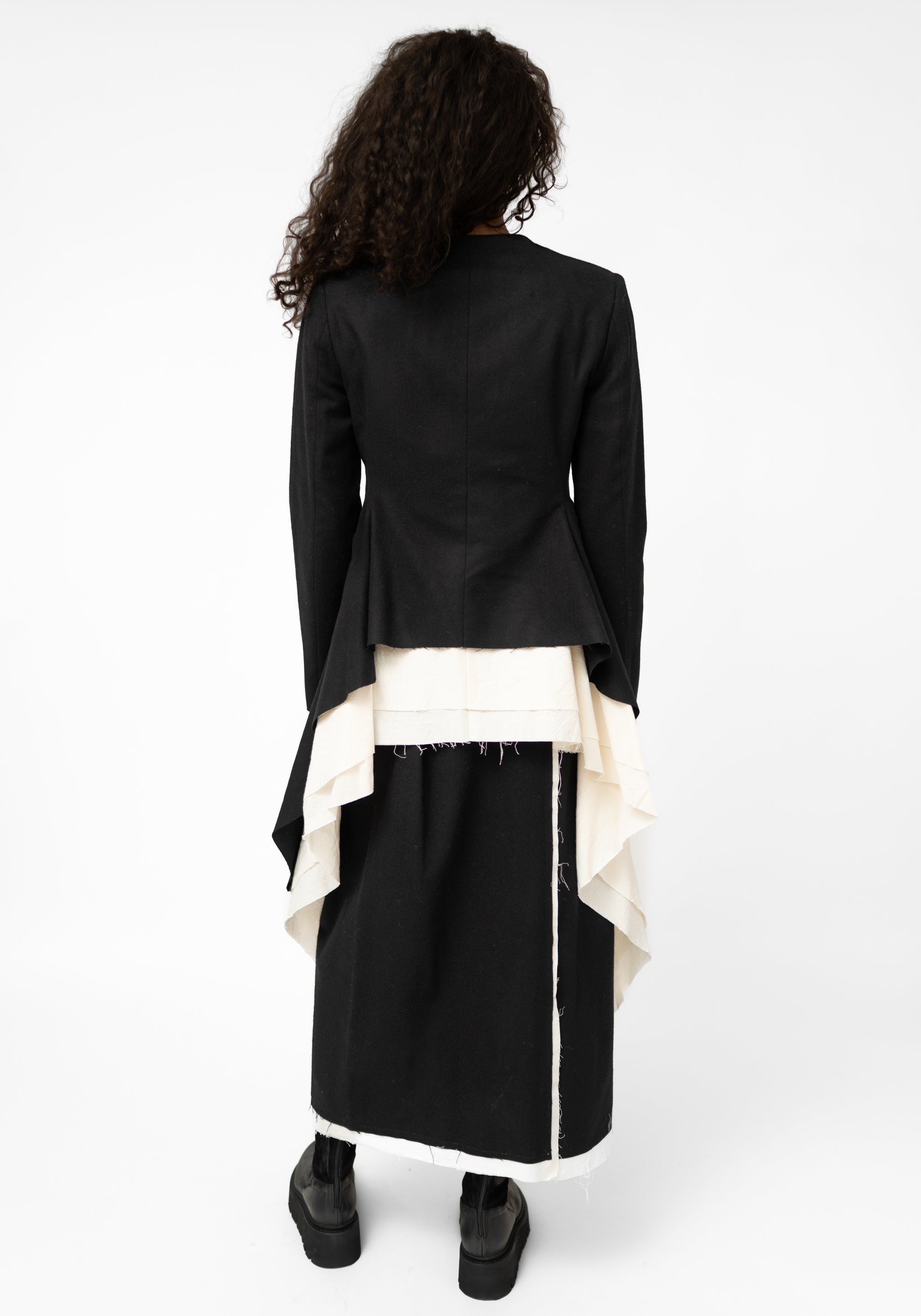 The Sueno Asymmetric Layered Wool Blend Jacket from Greece-based La Vaca Loca is designed for those who embrace bold, unconventional style. Its dramatic silhouette and asymmetric hem make it perfect for layering over wide-leg pants, dresses, or skirts, offering a statement piece for anyone drawn to inventive, expressive fashion.