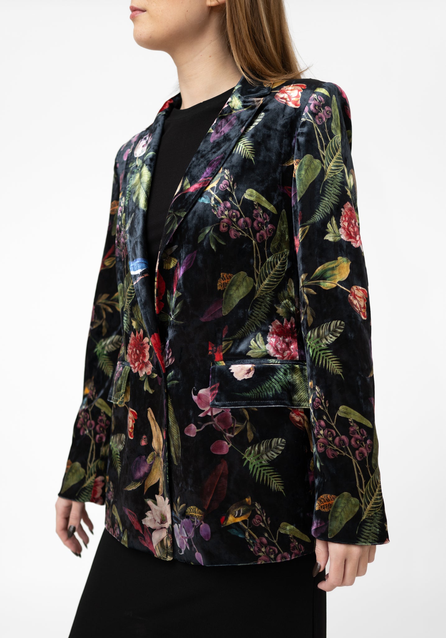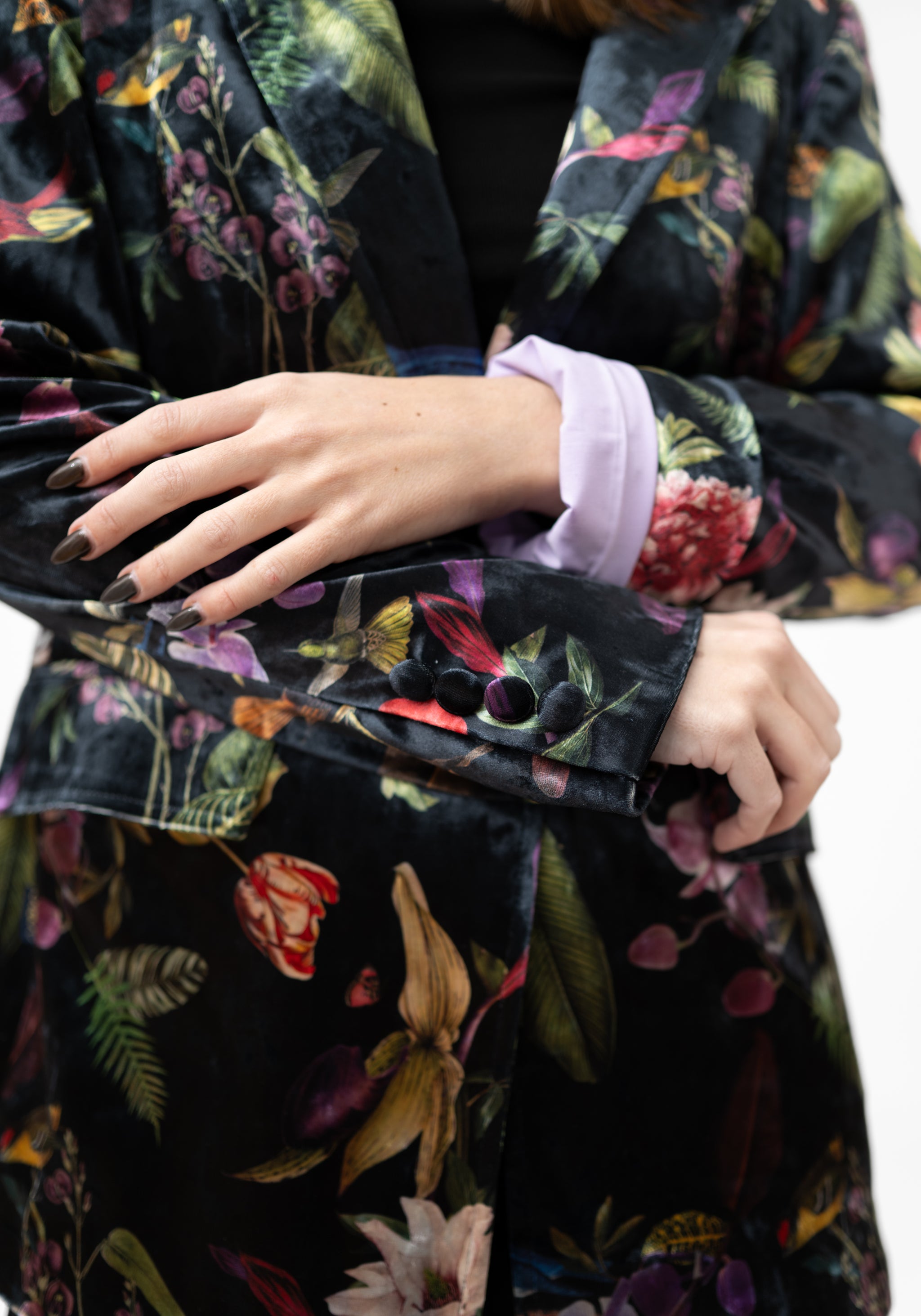 The Red Flowers Velvet Blazer from Colombia-based Muzaluci pairs tailored structure with a touch of mystical whimsy through its vibrant floral print and subtle design details. Designed for those who favor statement layering pieces, it elevates dresses, trousers, or jeans, adding color, texture, and a sense of refined drama to any outfit.