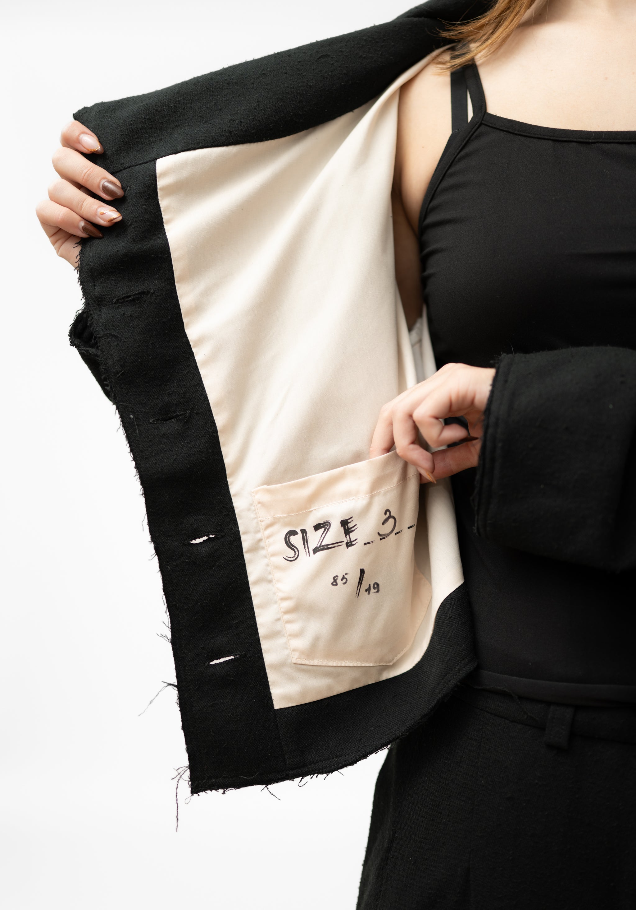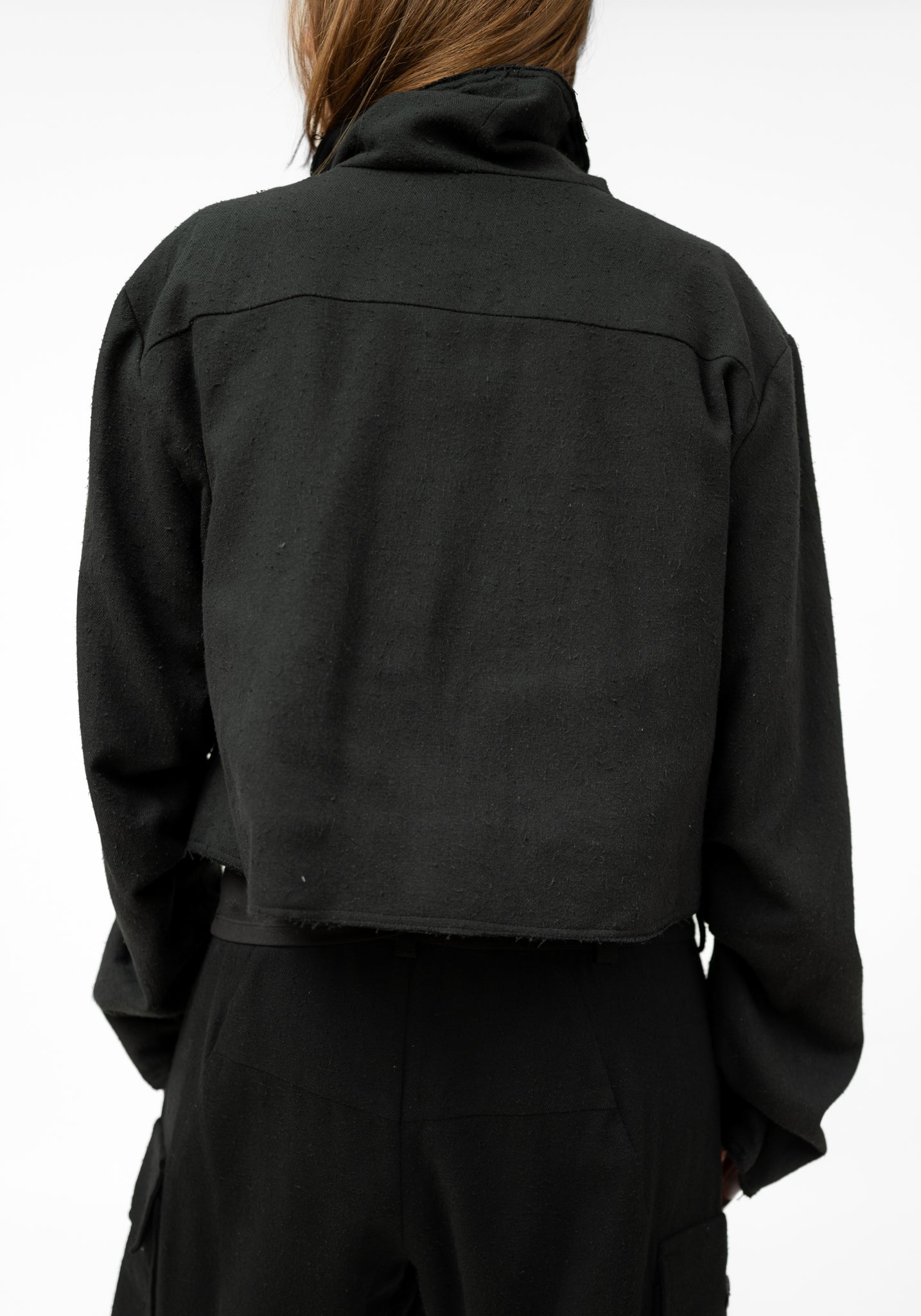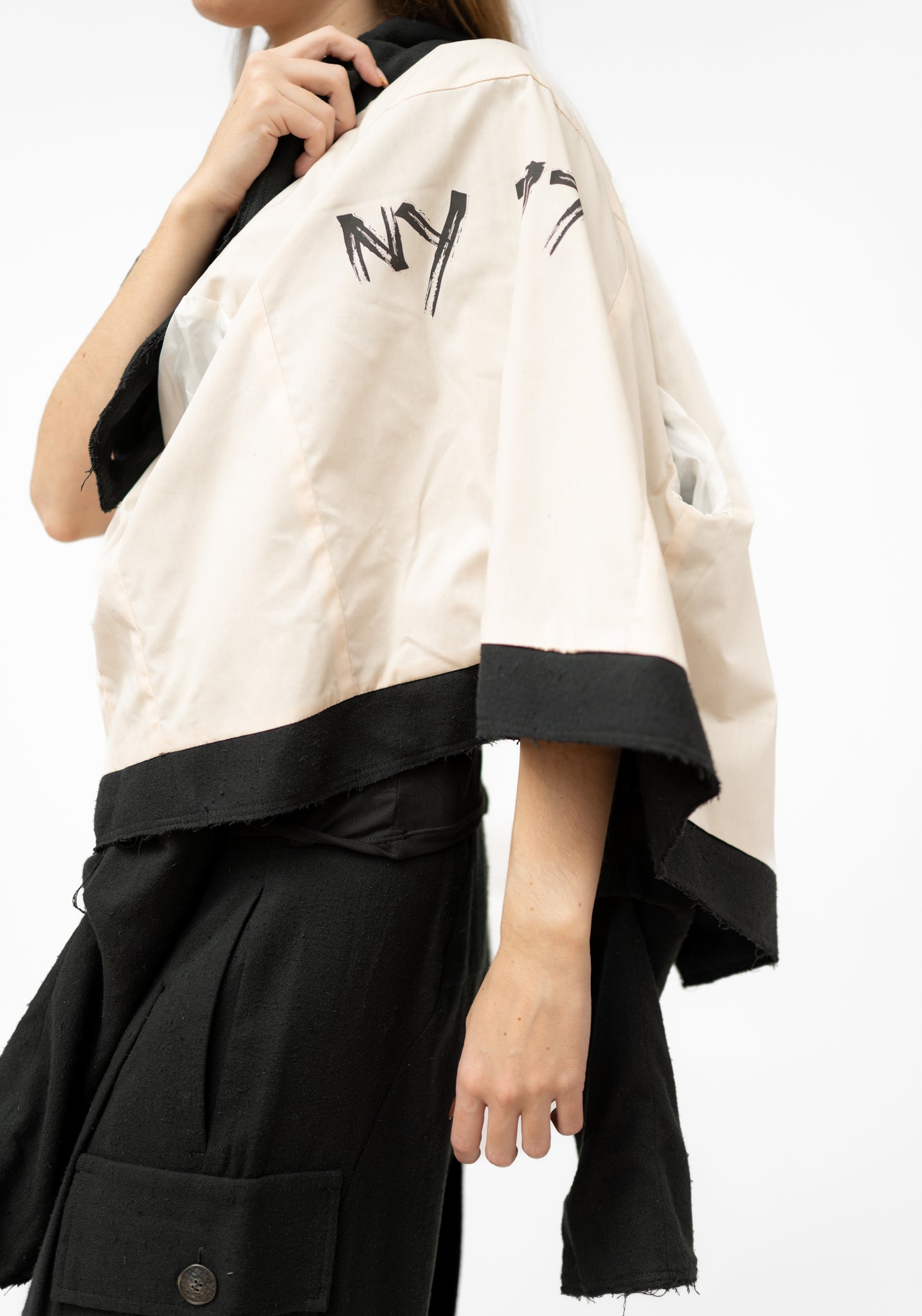 The Wired Details Cropped Silk Blend Jacket from NY 77 Design captures the brand’s architectural and urban sensibility through its structured silhouette and raw-edged finish. Crafted from a soft silk-cotton blend, its wired collar and cuffs can be shaped to create a customized look, bringing subtle attitude and individuality to any outfit. Perfect for adding polish to daily wear or elevating evening ensembles, style it with tailored trousers or a flowing skirt to balance its cropped, modern proportions.
