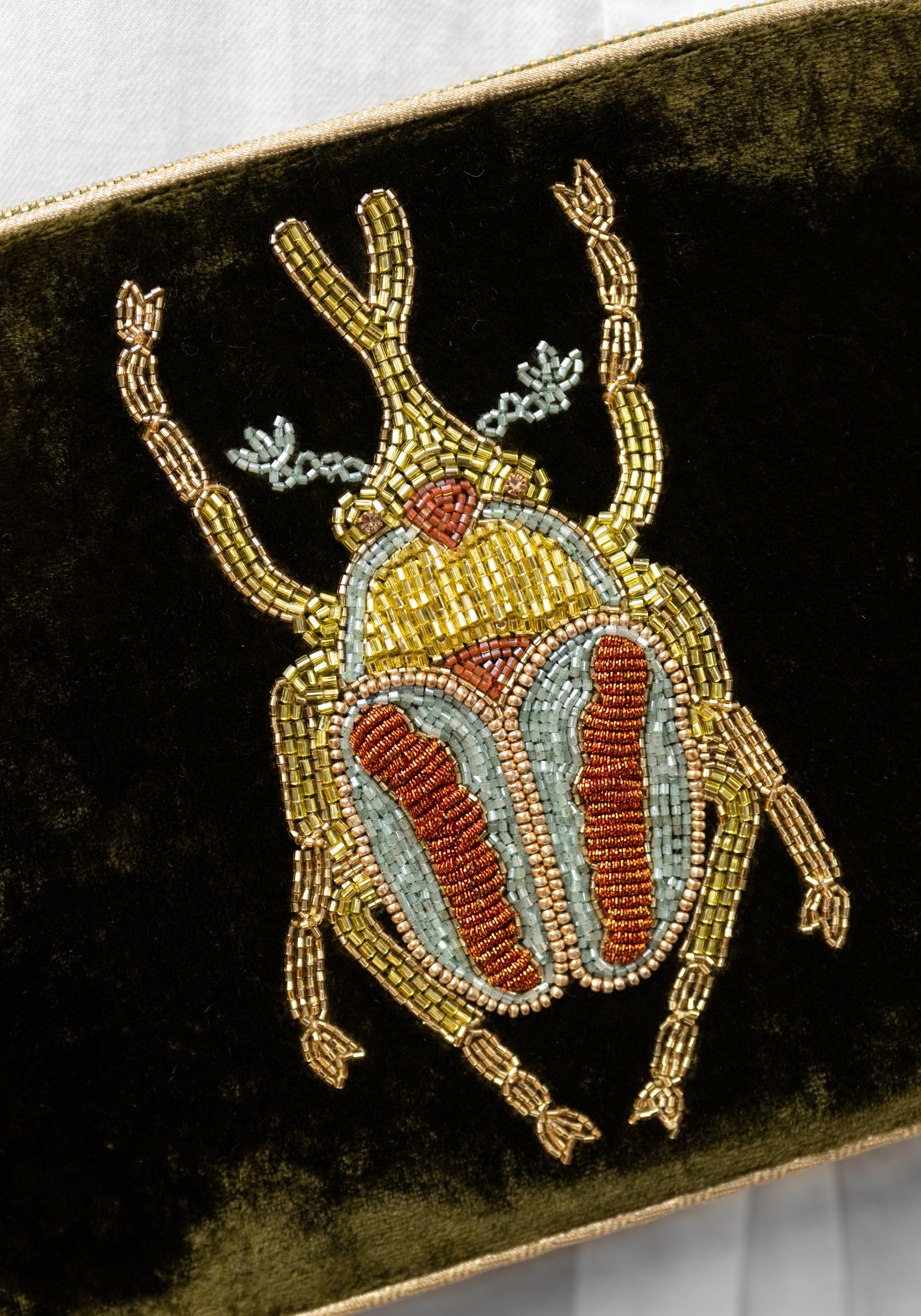 Khaki Velvet Beaded Beetle Crossbody Bag