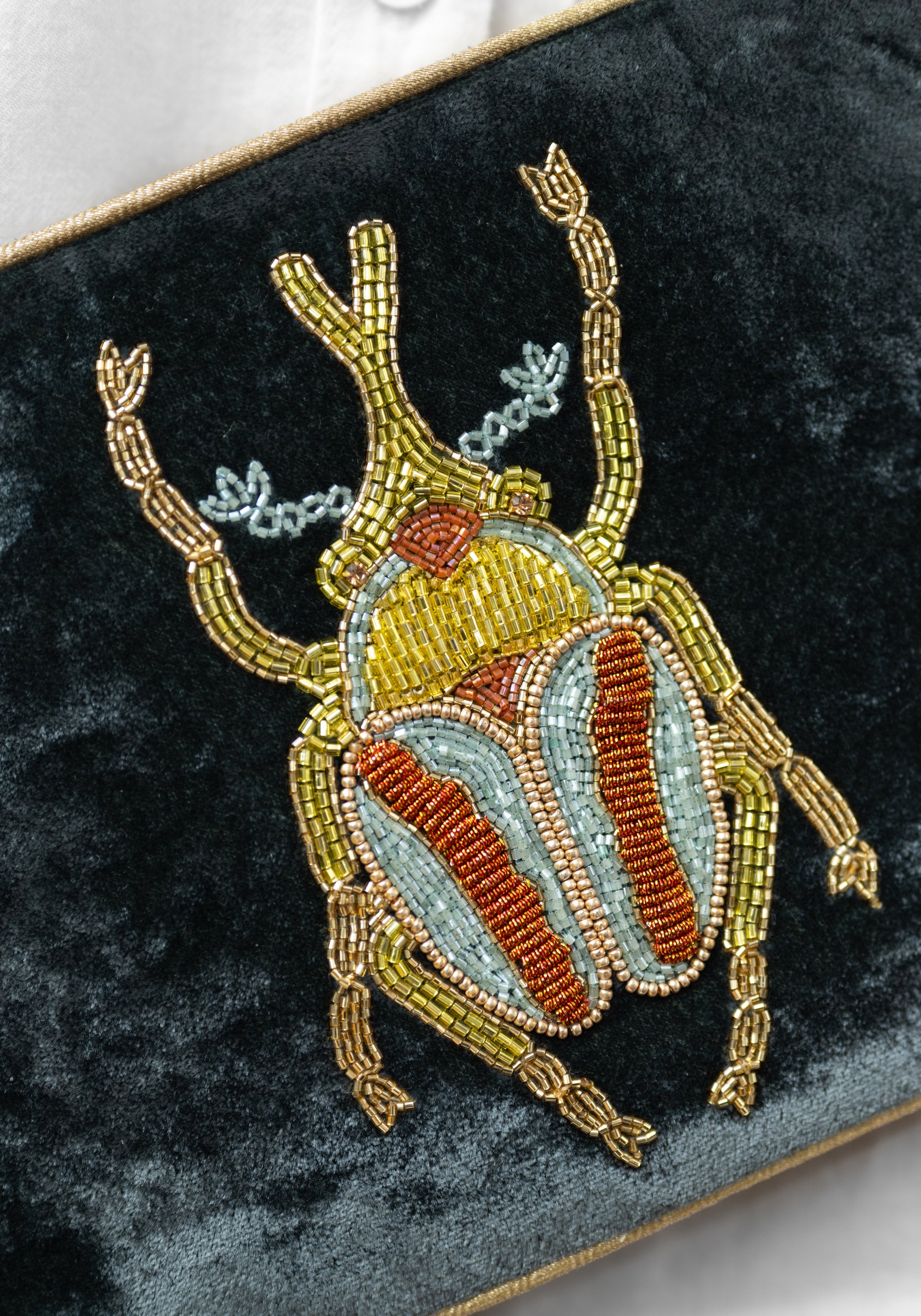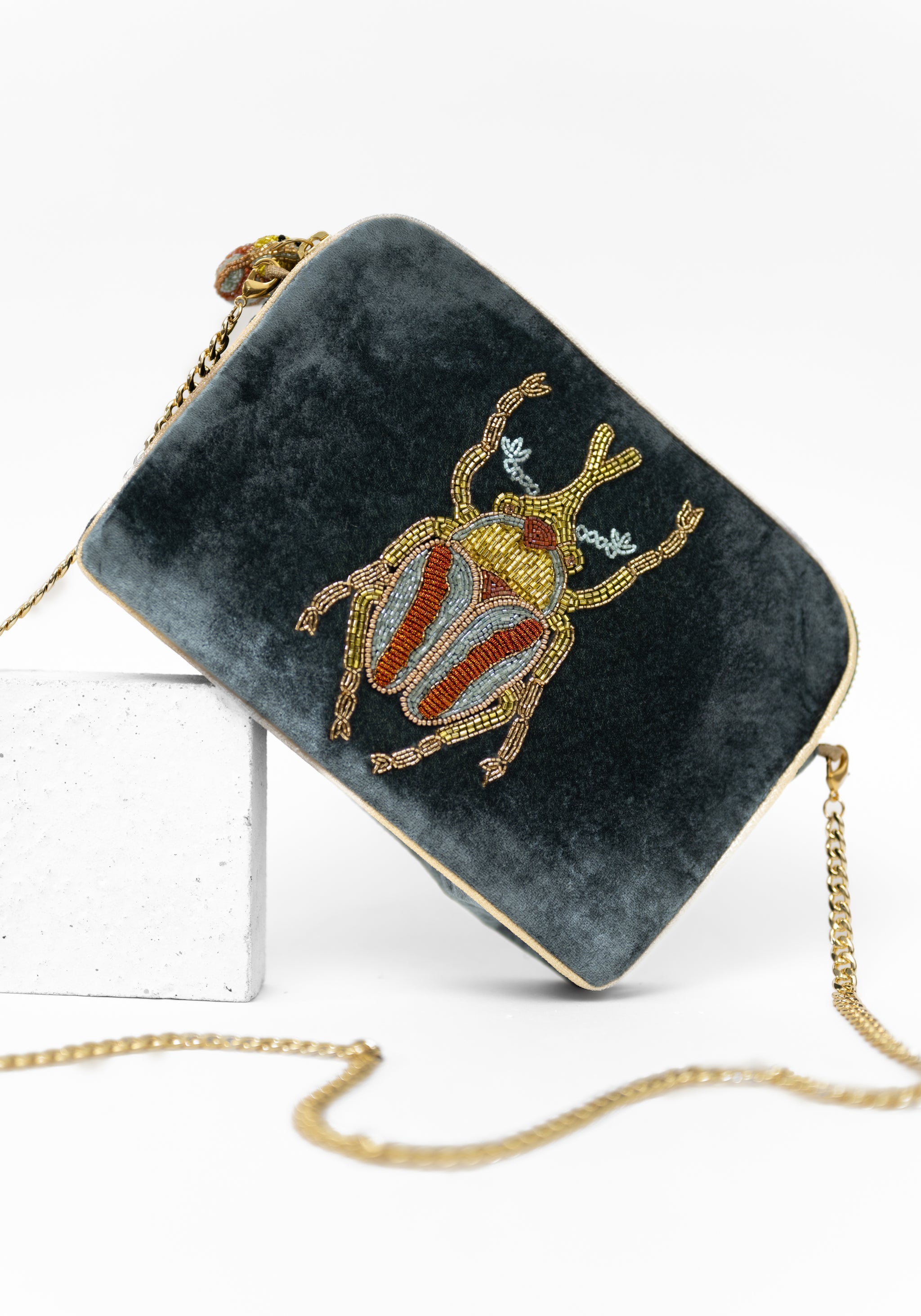 Light Teal Velvet Beaded Beetle Crossbody Bag
