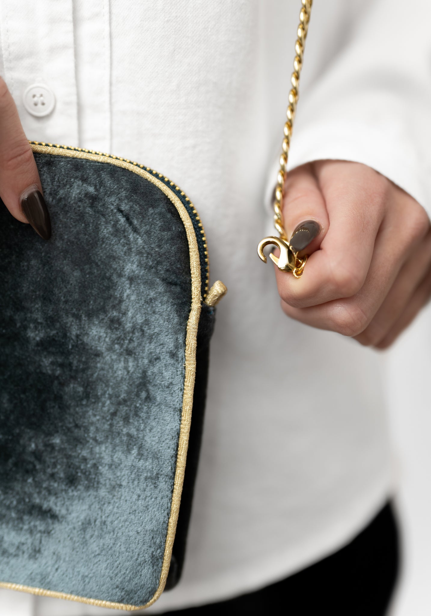 The Light Teal Velvet Beaded Beetle Crossbody Bag from Delhi-based Olivia Dar combines intricate Indian craftsmanship with a French touch. Designed for those who appreciate artful, rich accessories, it features detailed golden beadwork. Perfect for elevating everyday outfits or making a statement at evening events, it can be worn crossbody or carried as a shoulder bag.