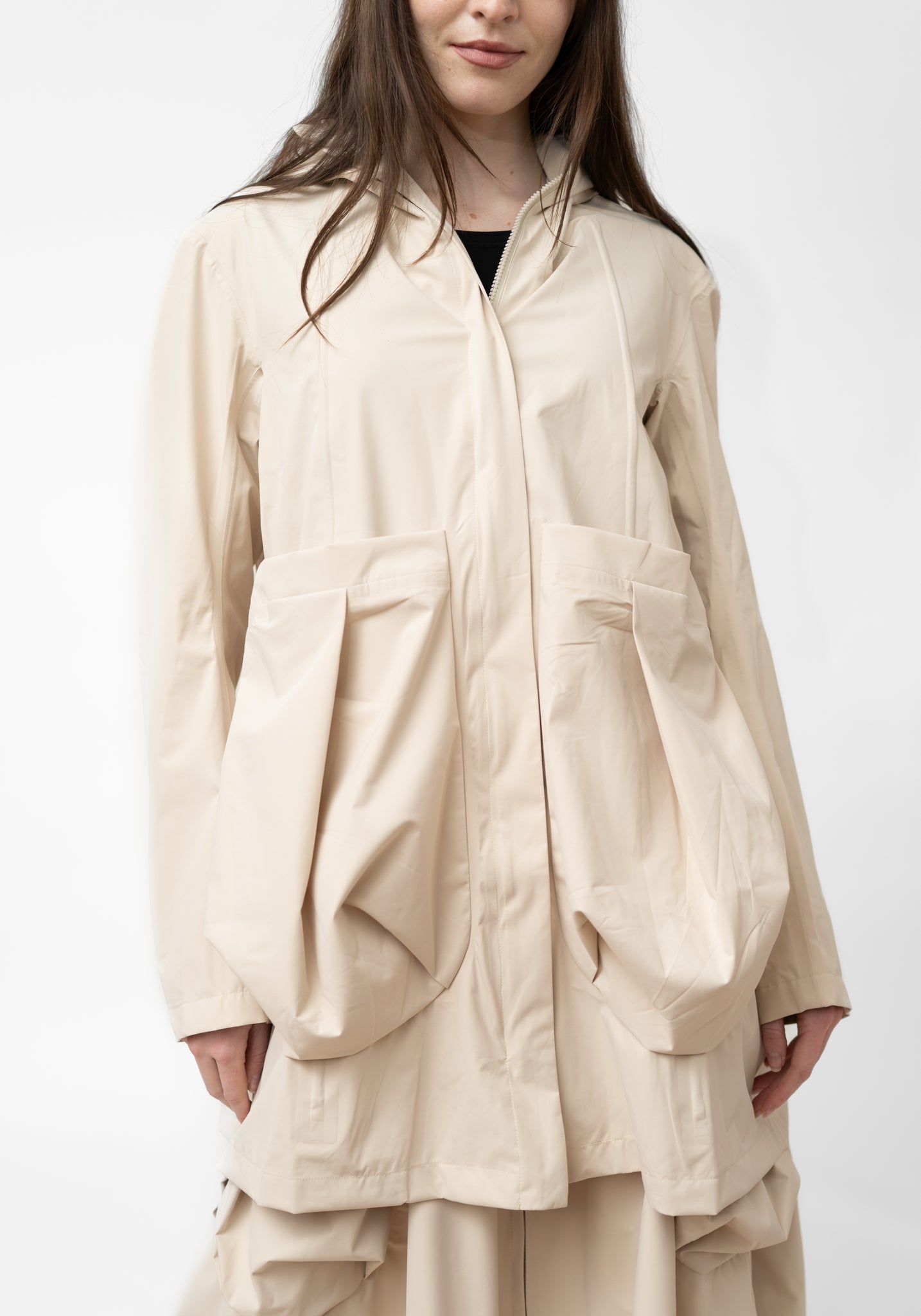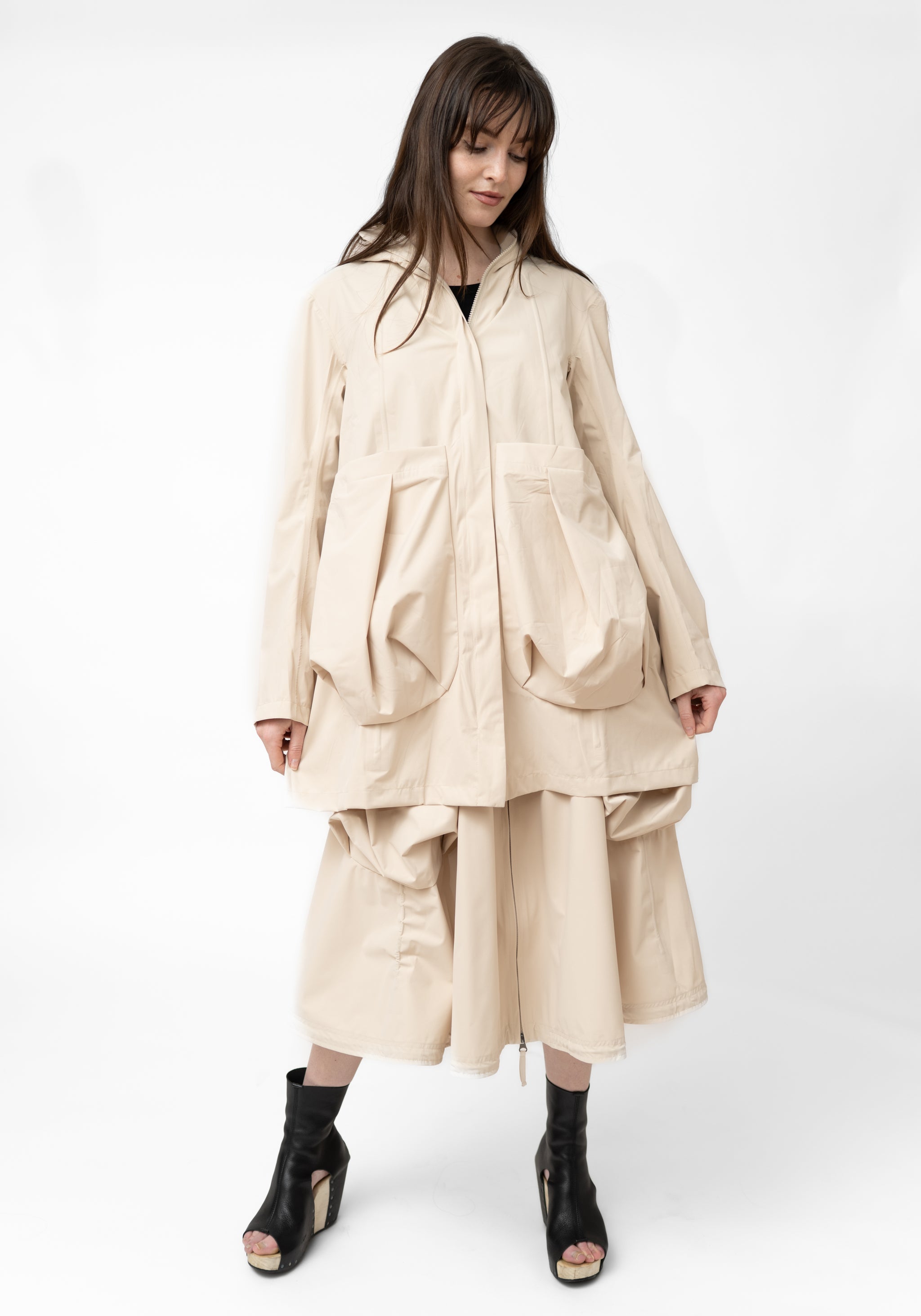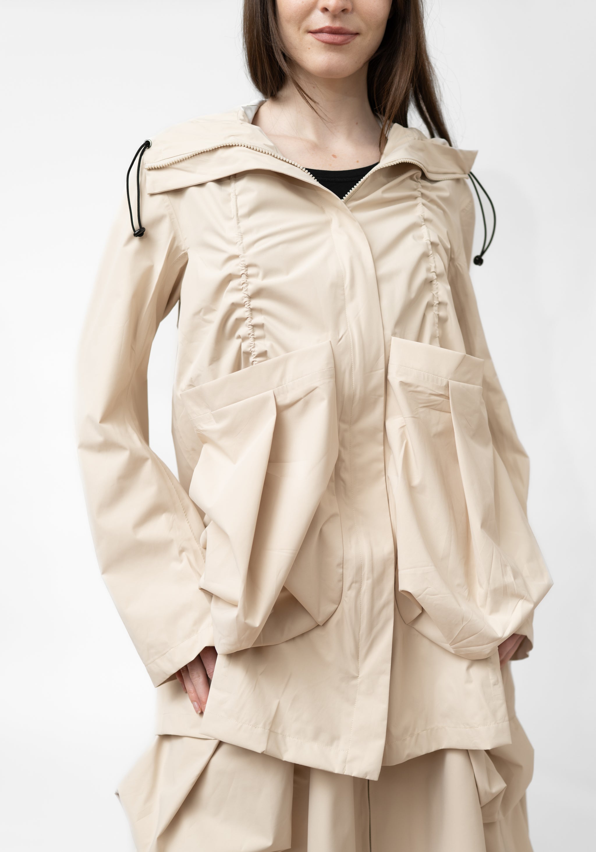 The Bold Pockets Detail Hooded Waterproof Jacket from Germany-based Rundholz showcases the brand’s inventive outerwear with pleated pockets and adjustable ruching. Ideal for those who value functional, statement pieces, wear it with wide leg pants or skirts to highlight its pocket detailing.
