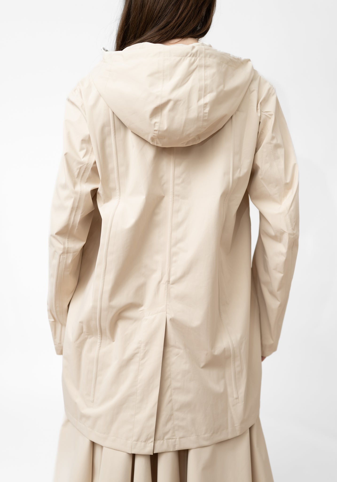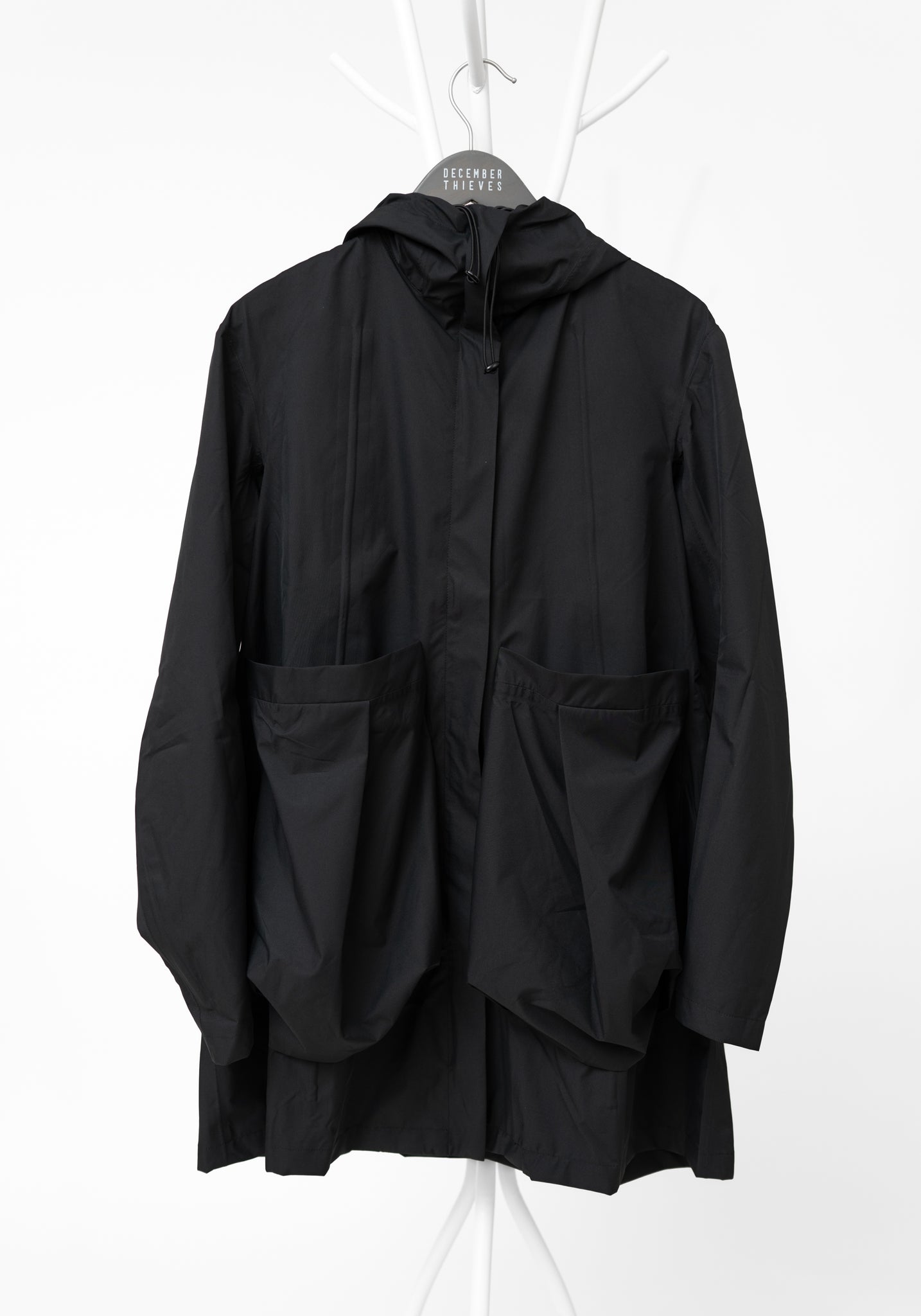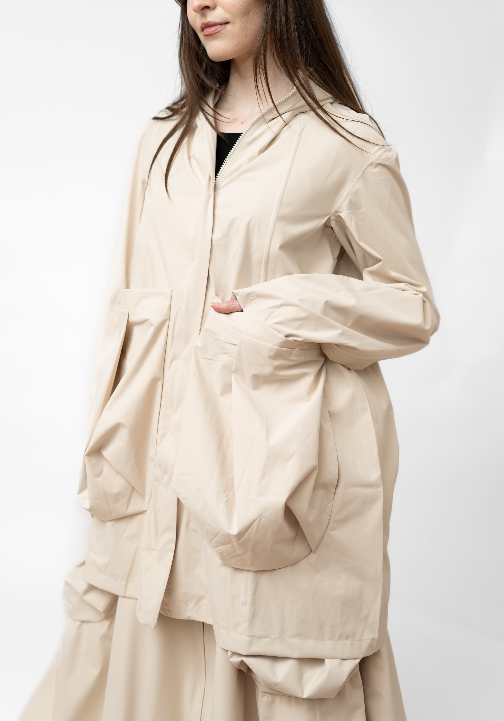 The Bold Pockets Detail Hooded Waterproof Jacket from Germany-based Rundholz showcases the brand’s inventive outerwear with pleated pockets and adjustable ruching. Ideal for those who value functional, statement pieces, wear it with wide leg pants or skirts to highlight its pocket detailing.