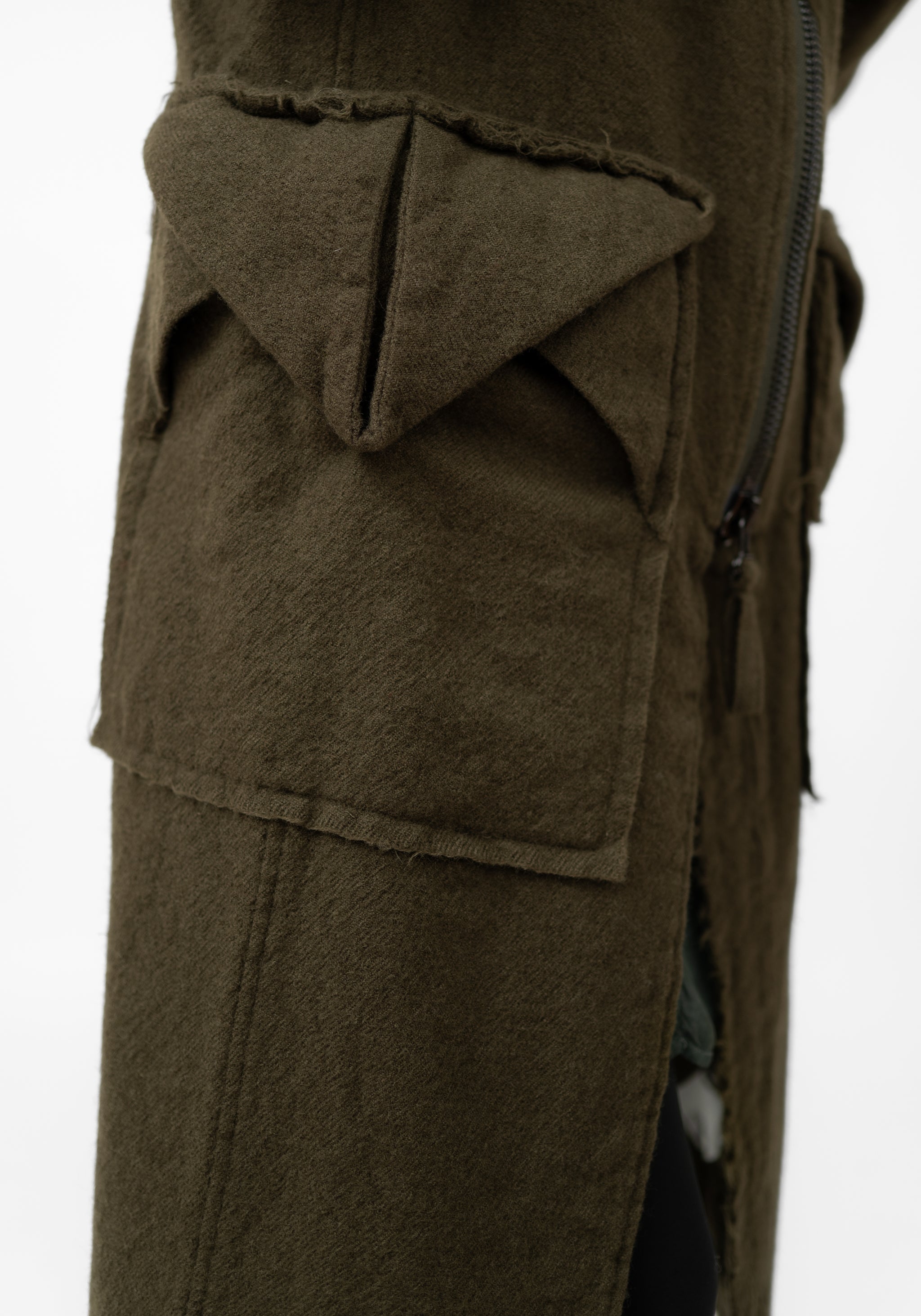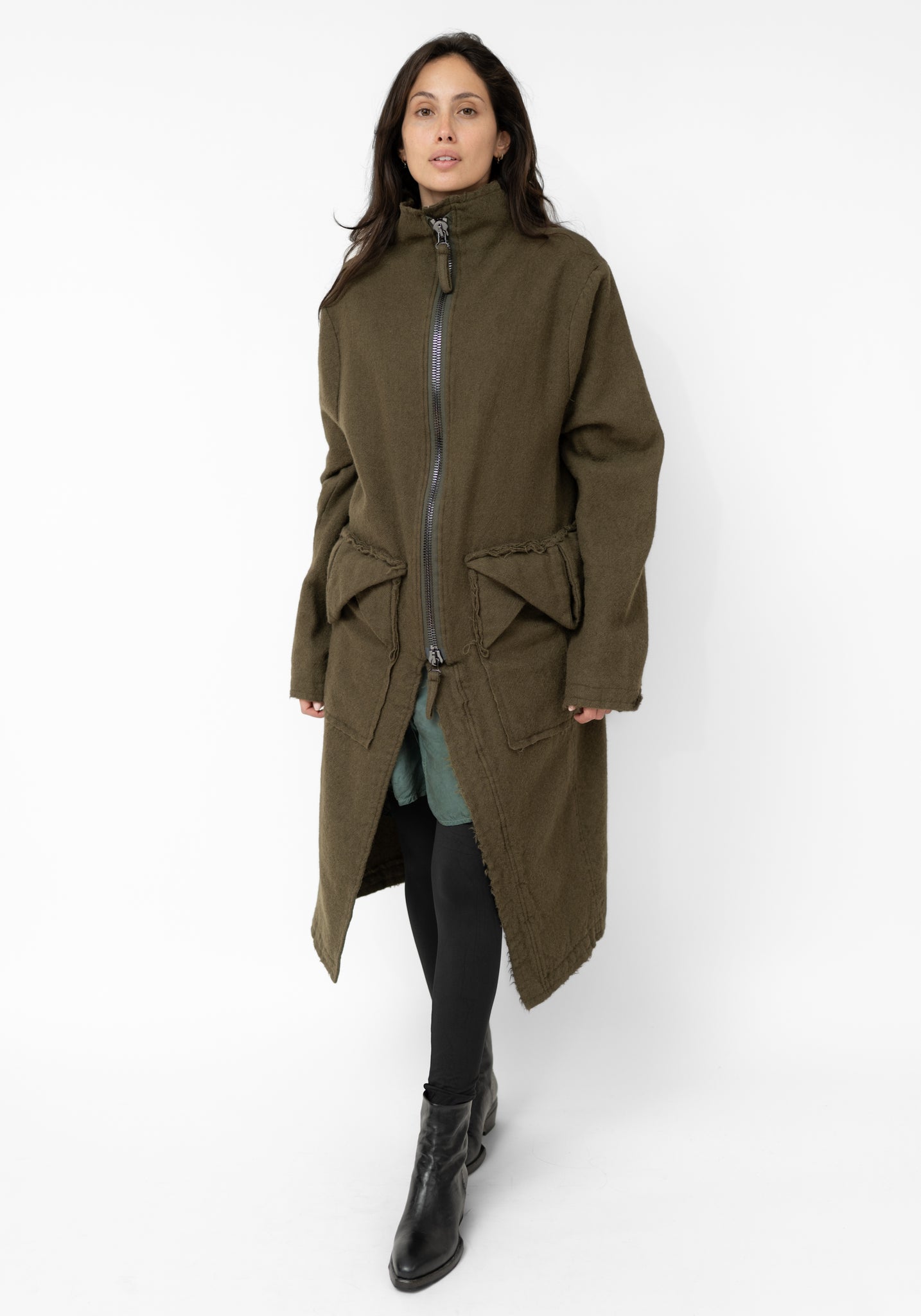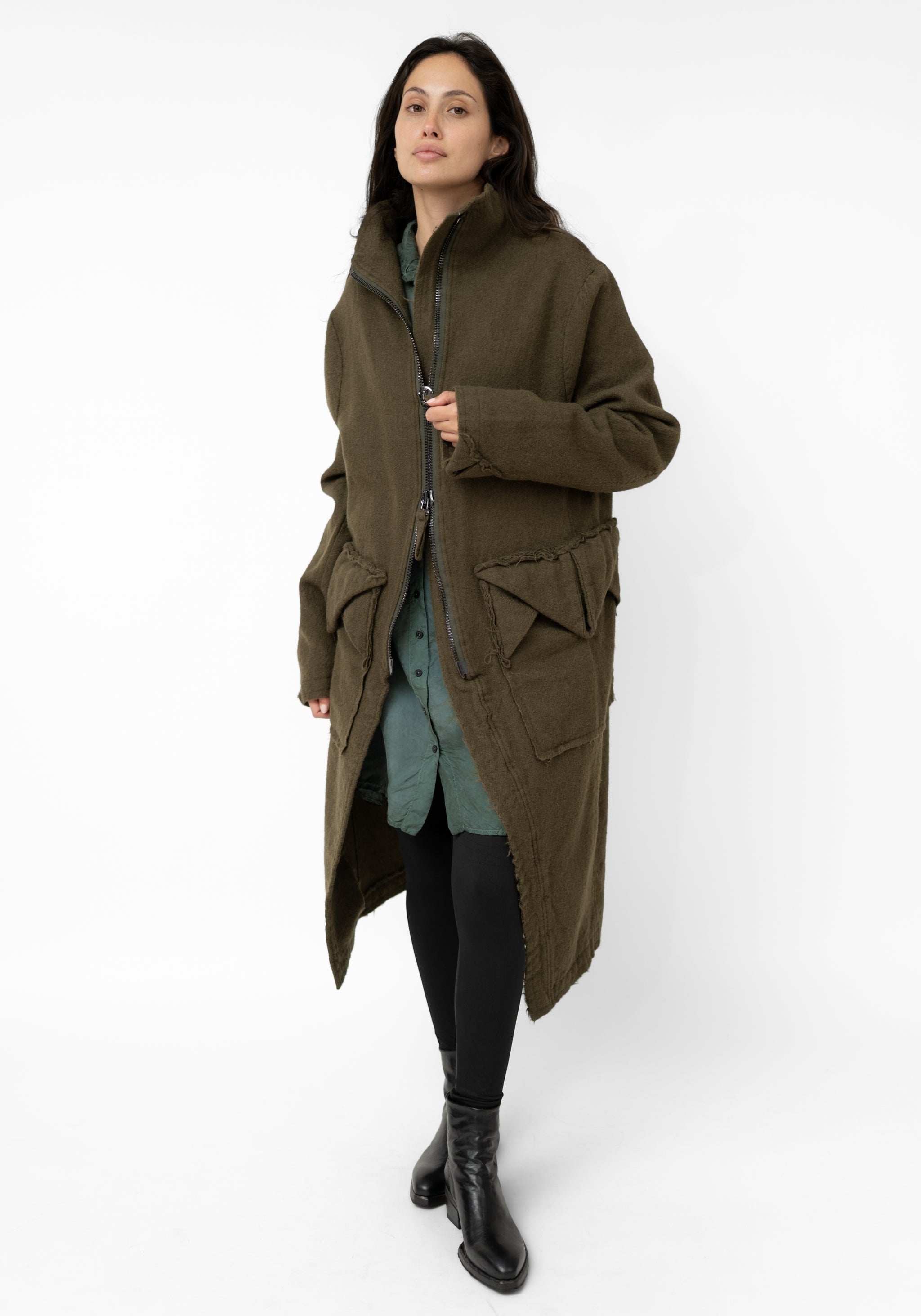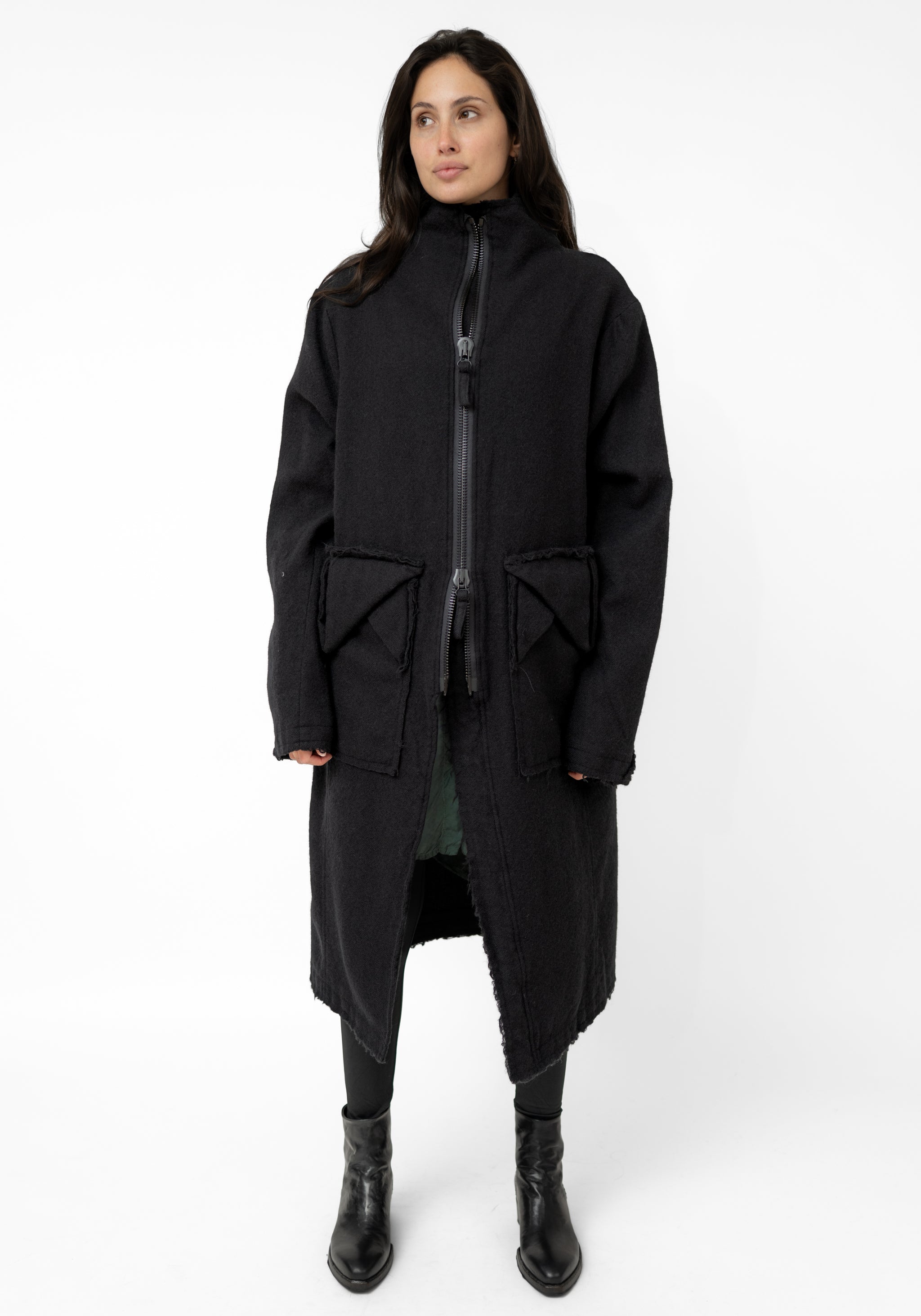 The Distressed Details Wool Maxi Jacket from Germany-based Rundholz DIP features a bold silhouette with a high neck, zip closure, and frayed edges for a dramatic, artful effect. Designed for those drawn to statement outerwear, it brings edgy sophistication to layered outfits. Perfect for pairing with slim trousers, wide-leg pants, or layered dresses, the kick slit and flap pockets add movement and functional detail.