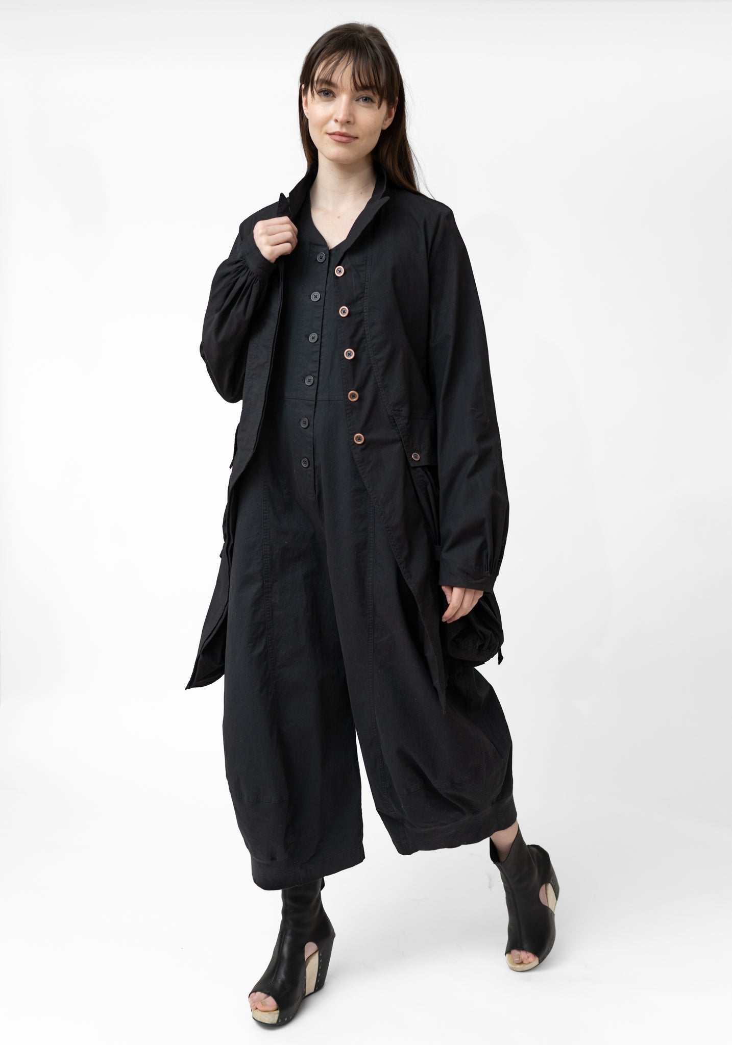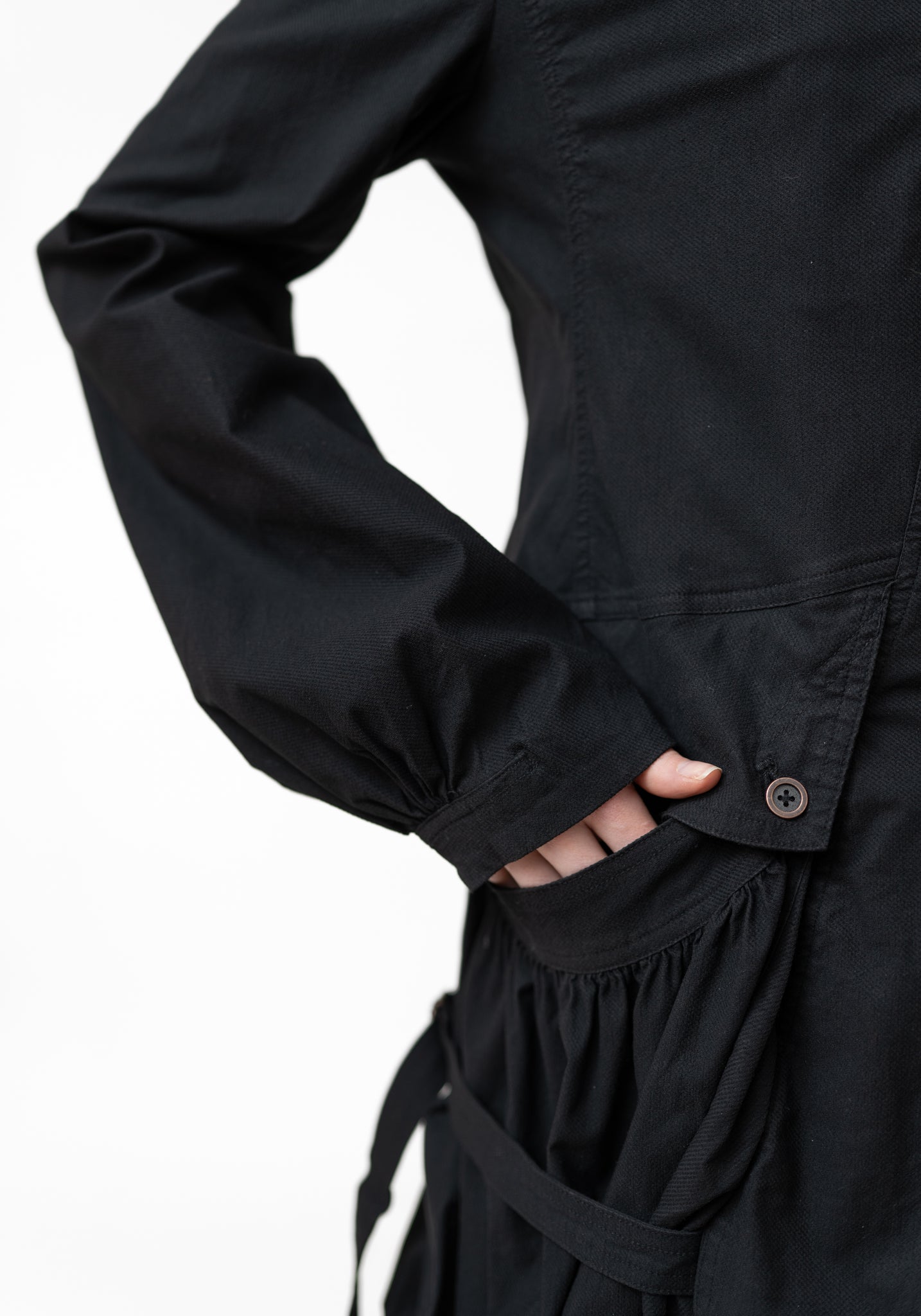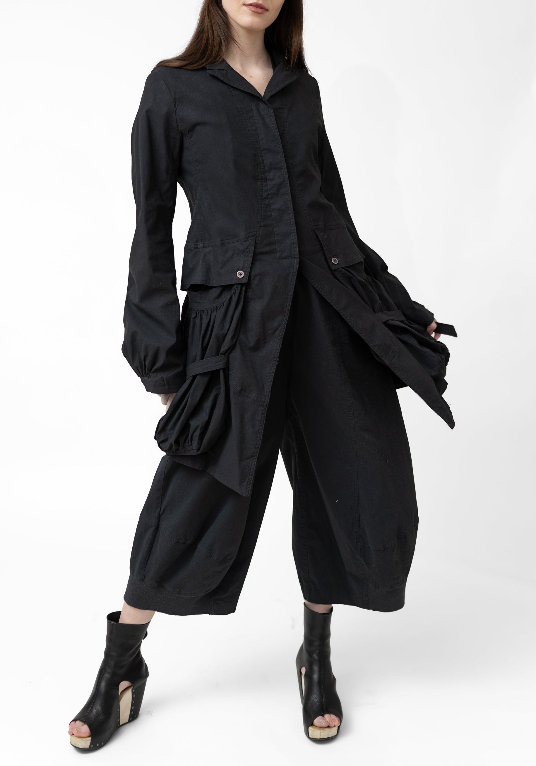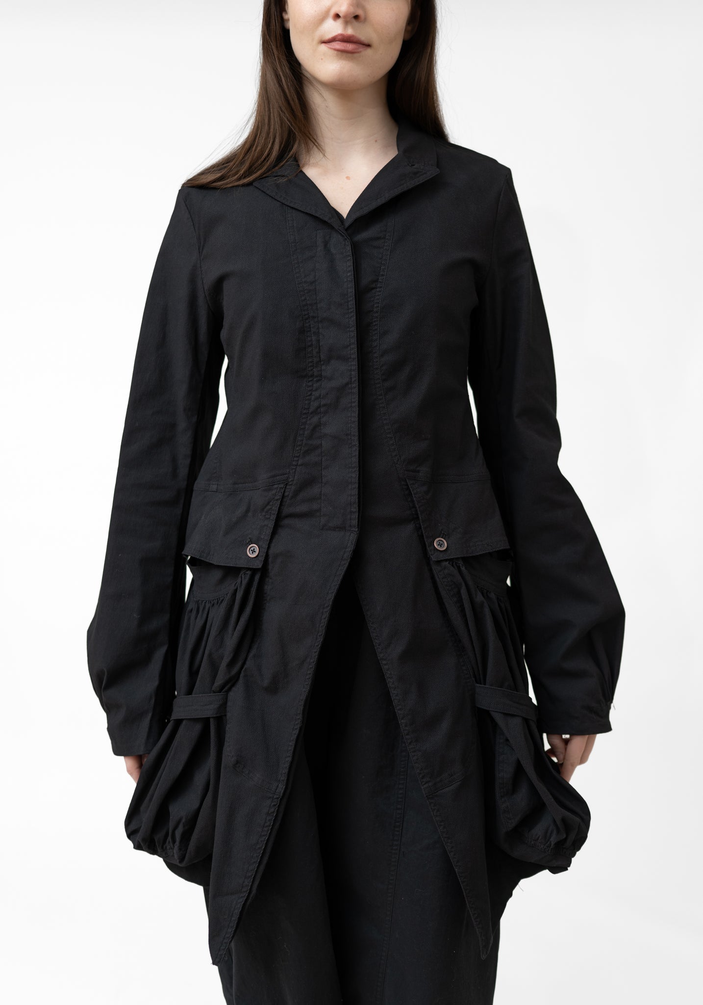 The Gathered Sleeve Bold Pocket Detail Jacket from Germany-based Rundholz DIP embodies the brand’s avant-garde approach with layered flap pockets and gathered sleeves. Designed for those who embrace bold, artistic fashion, it can be paired with fitted trousers or a simple dress to highlight the pocket and cuff details.