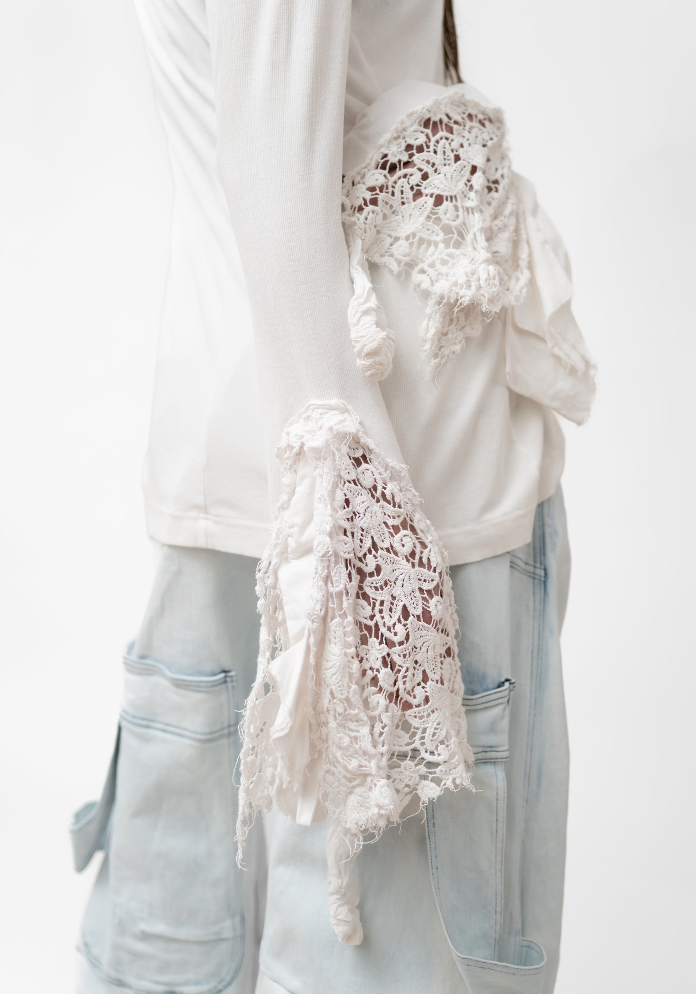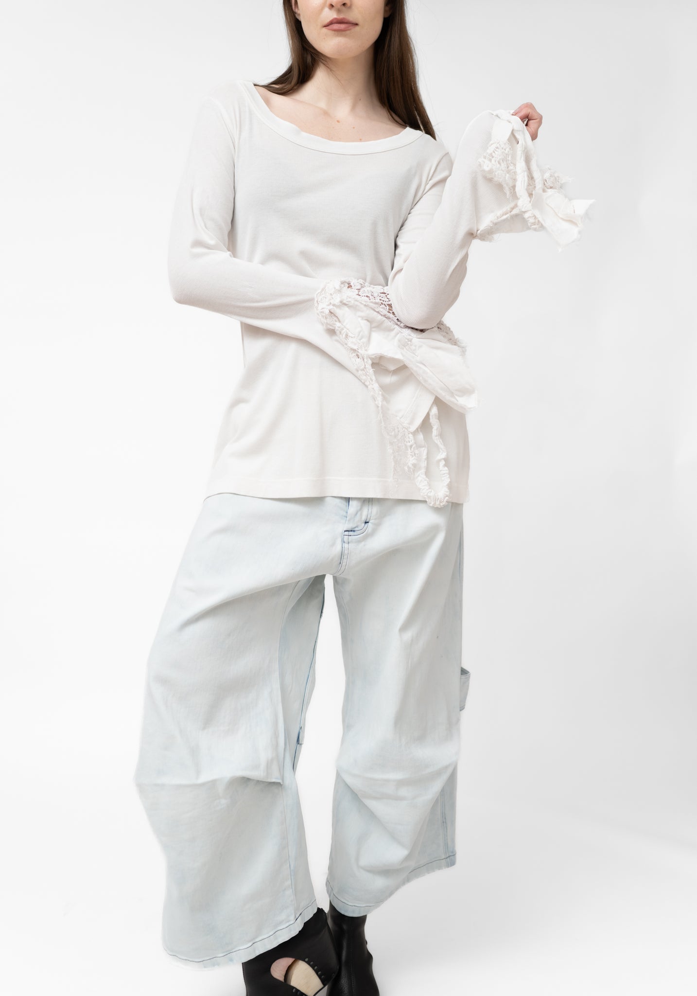 The Lace Cuff Detail Long Sleeve T-Shirt from Germany-based Rundholz DIP showcases the brand’s subtle design twists with lace-trimmed cuffs and draped raw panels. Perfect for those who appreciate artistic pieces, it pairs beautifully with wide leg trousers or peeking out under a blazer to highlight the delicate sleeve detailing.