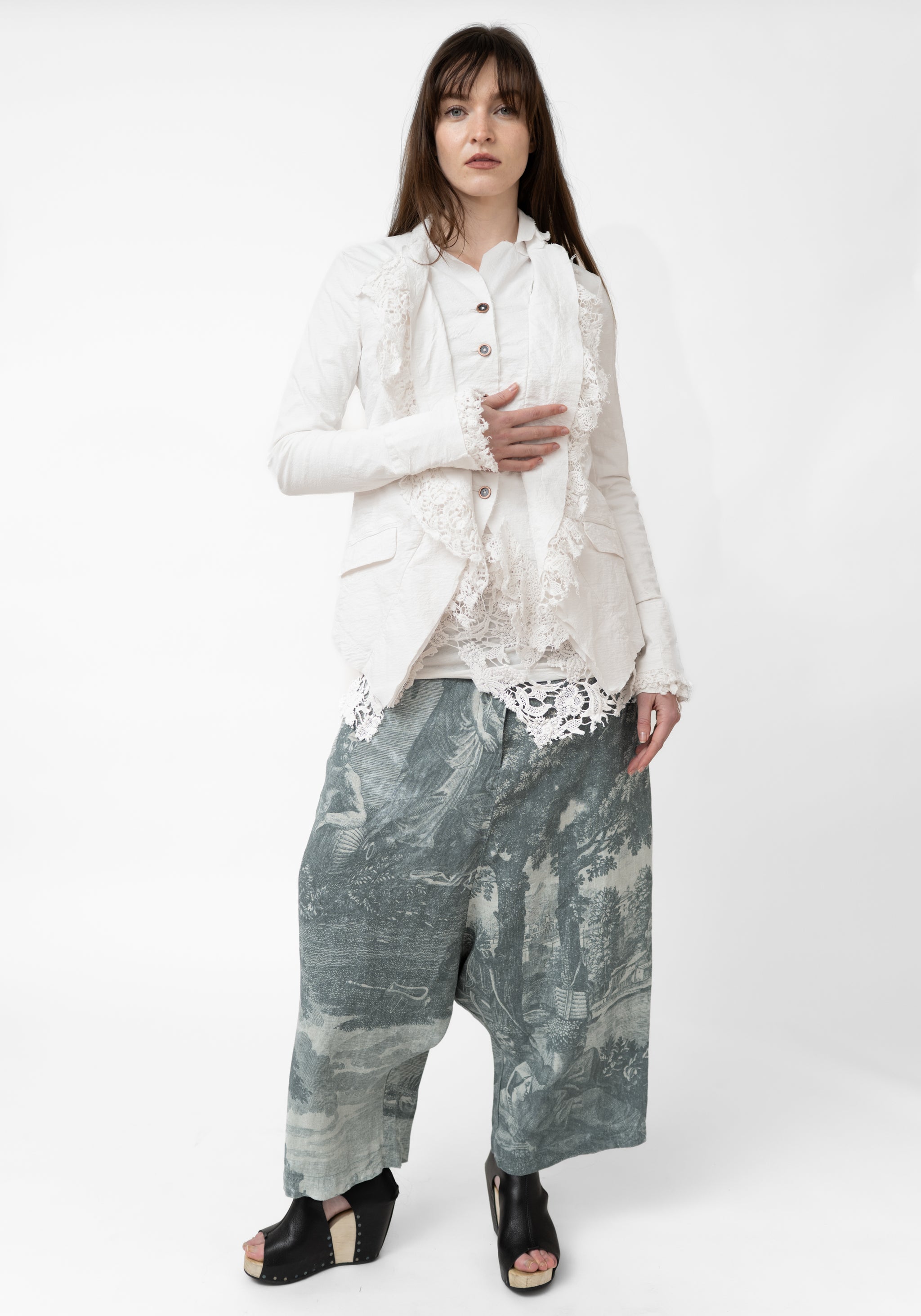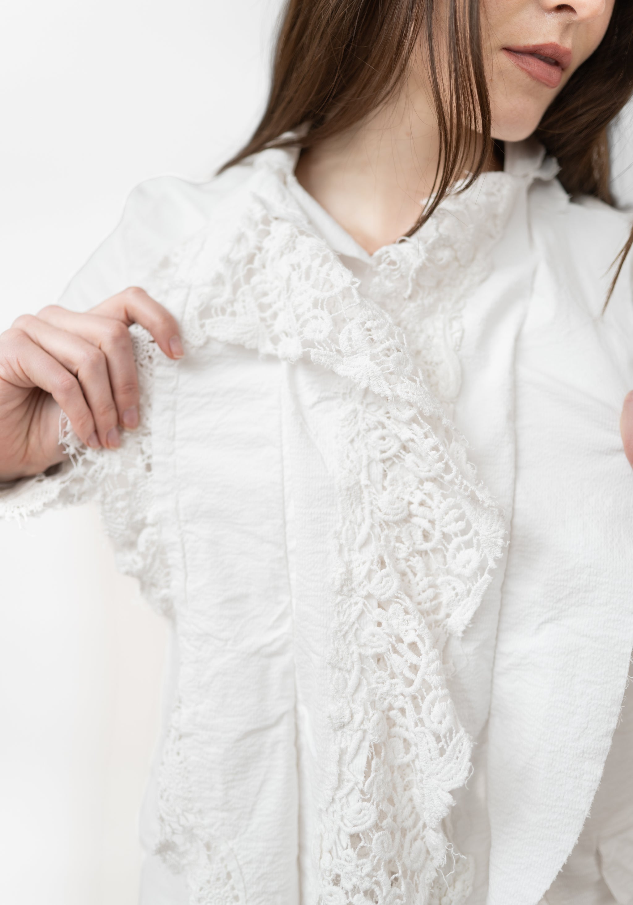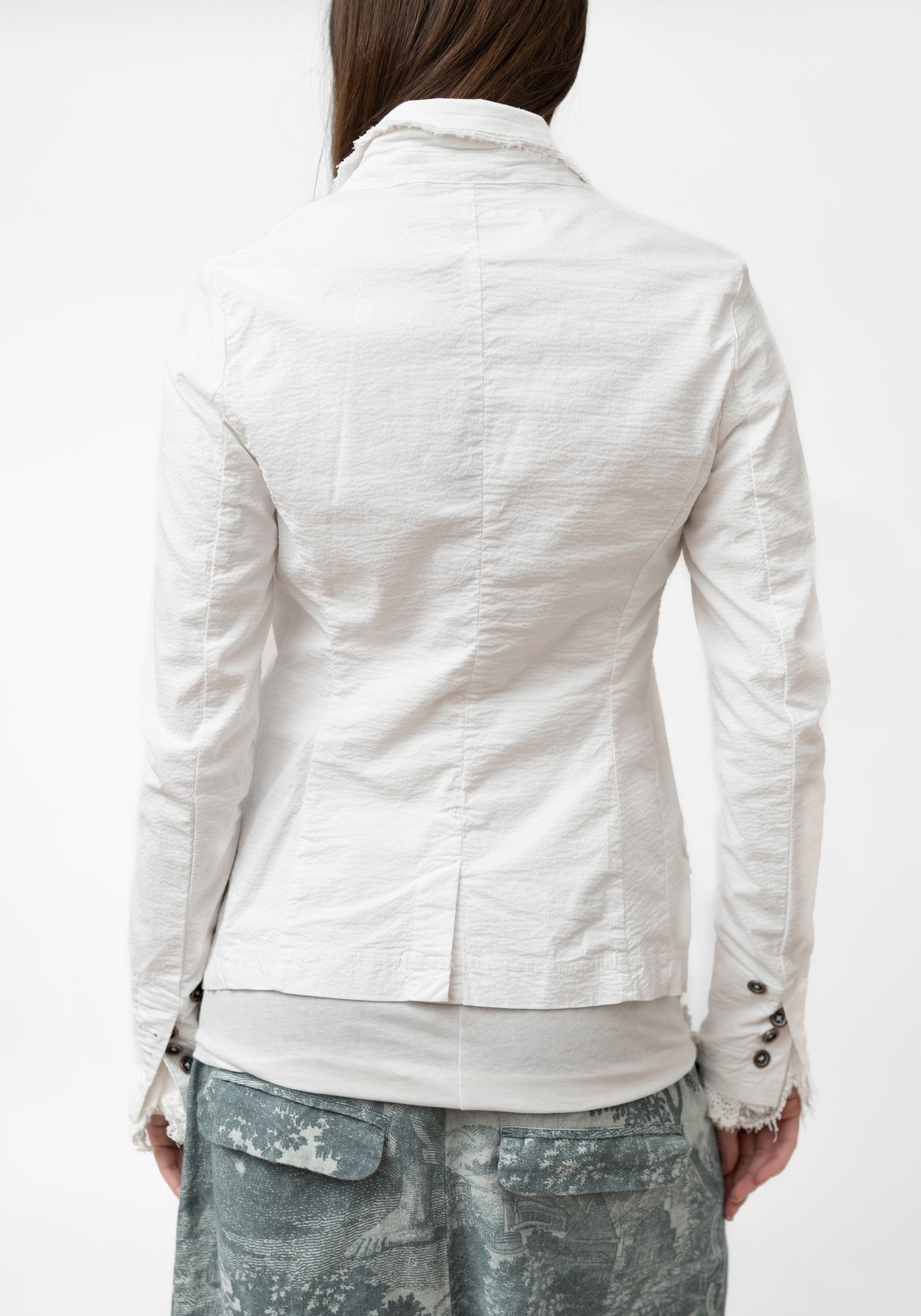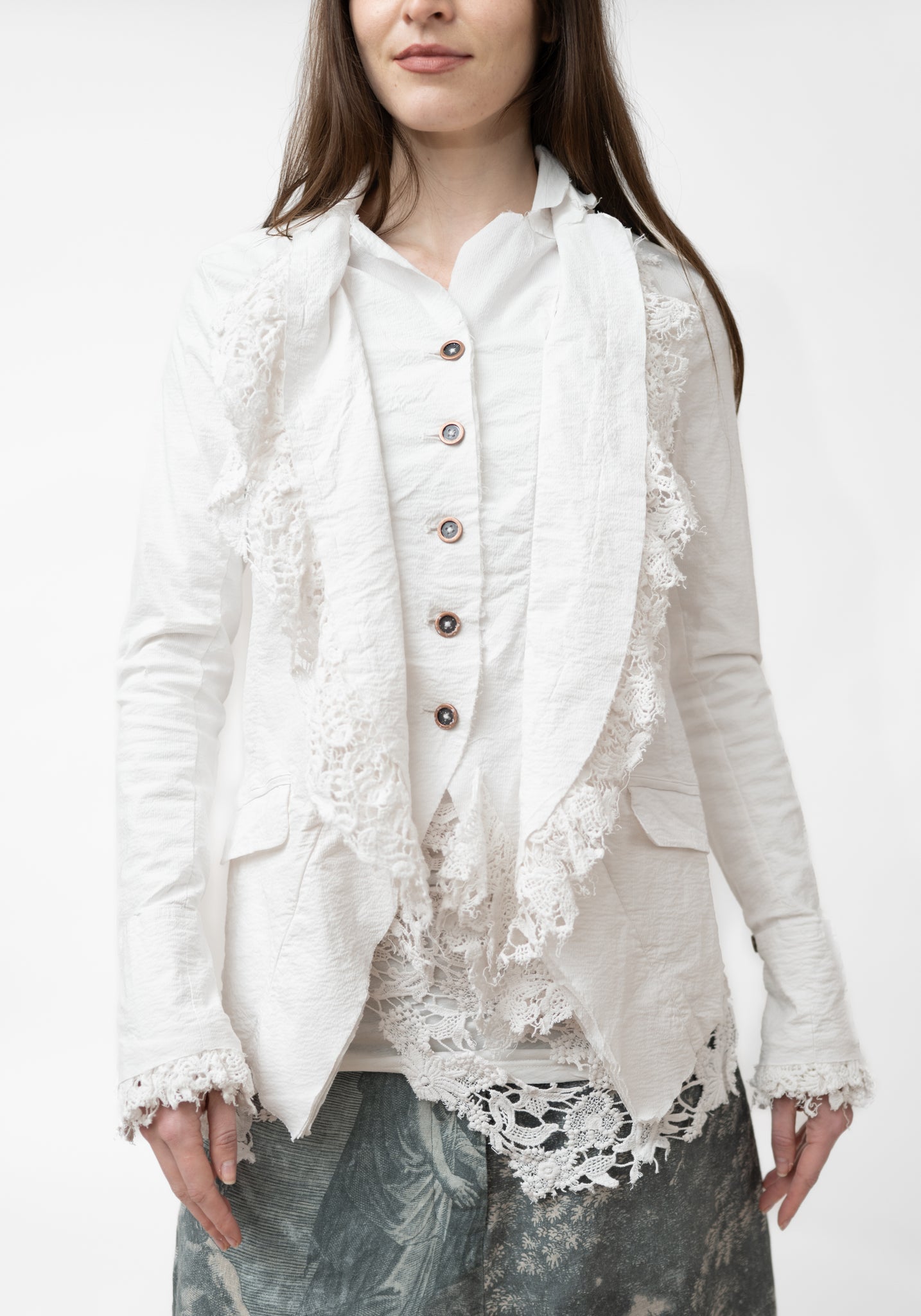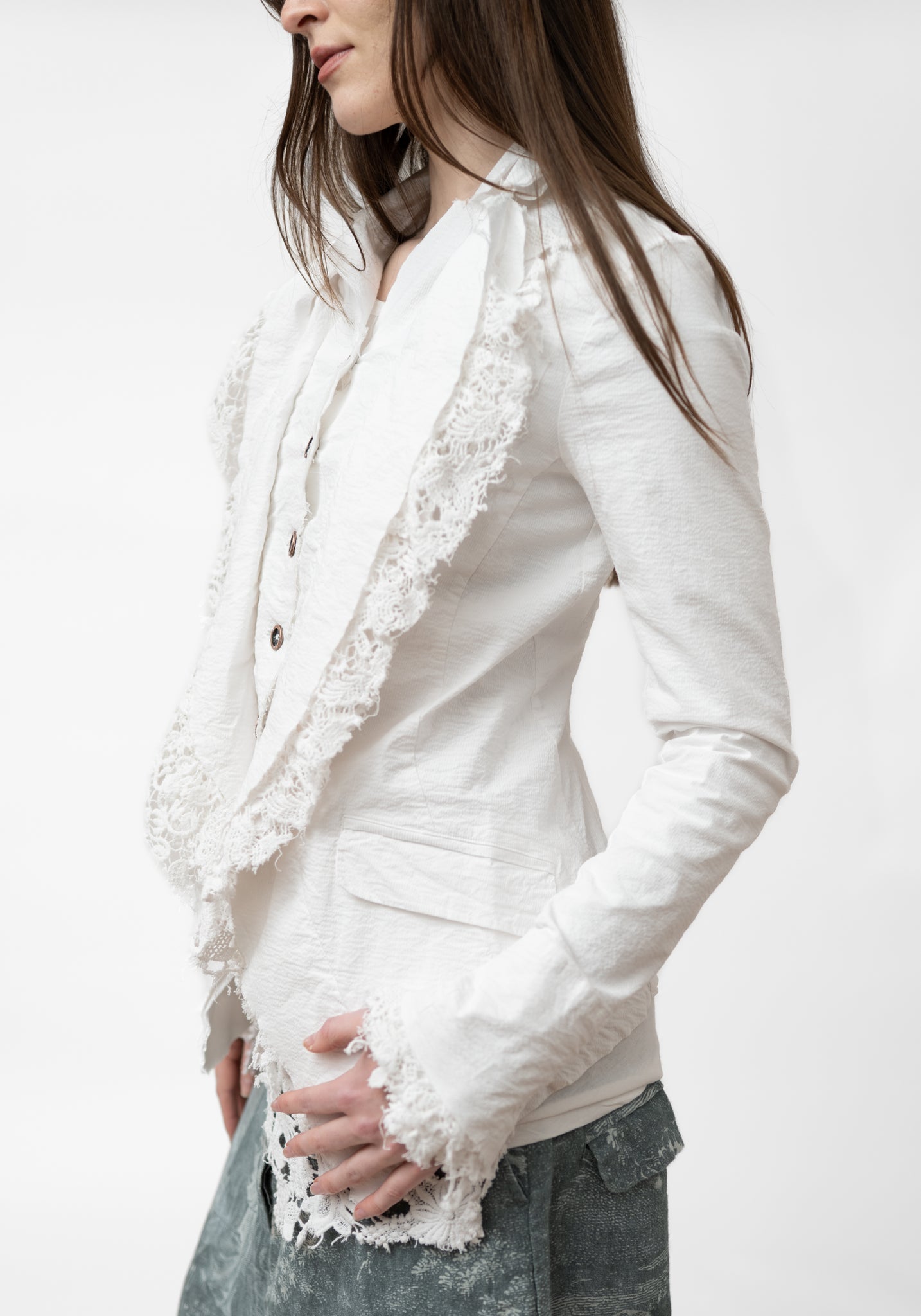 The Lace Edge Detail Stretch Tailored Jacket from Germany-based Rundholz DIP features a tailored silhouette with layered lace lapels and raw-edge detailing for an avant-garde finish. Designed for those who favor elevated, artistic fashion, wear it with fitted pants or skirts to accentuate the lace trims and asymmetric hem.
