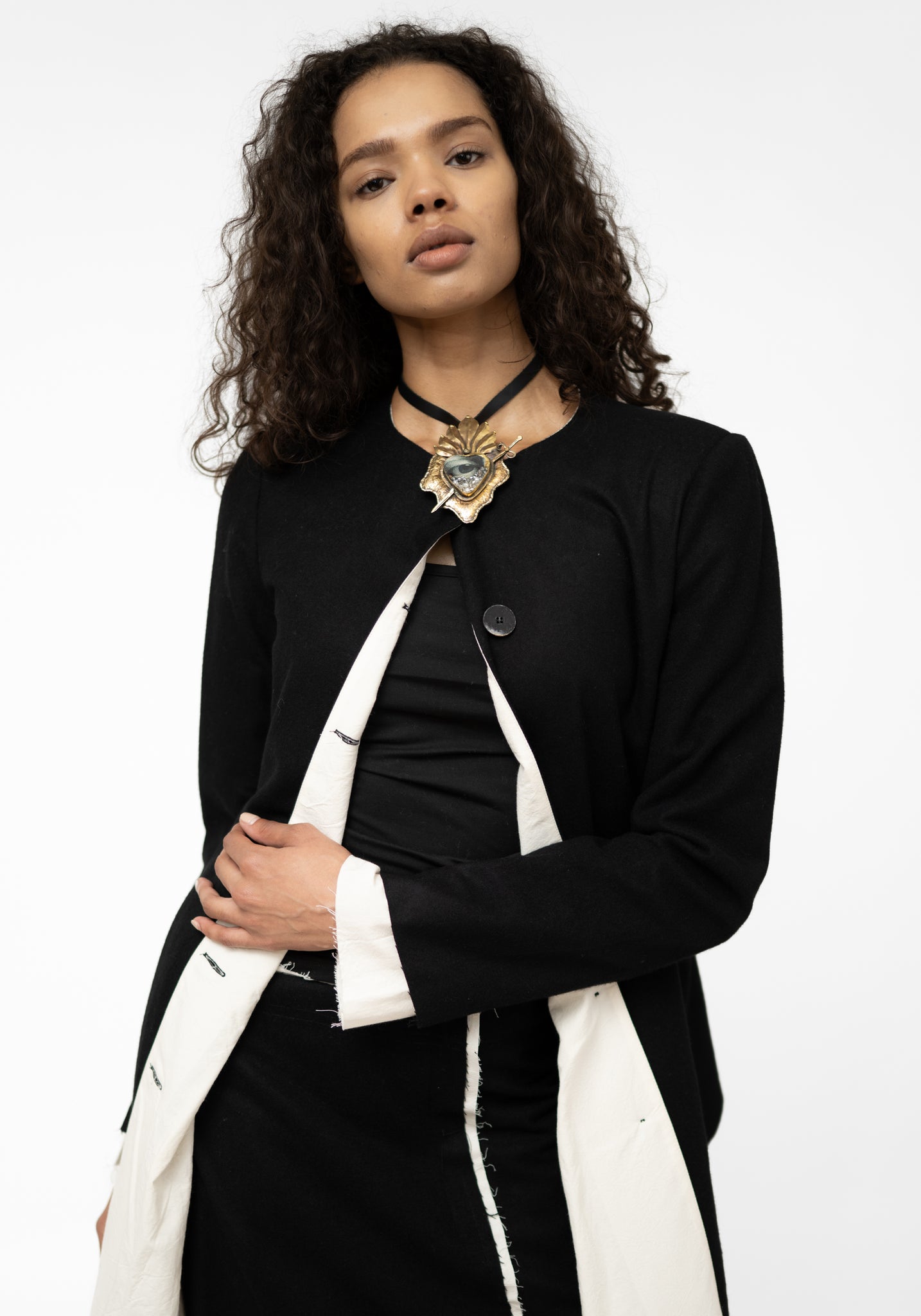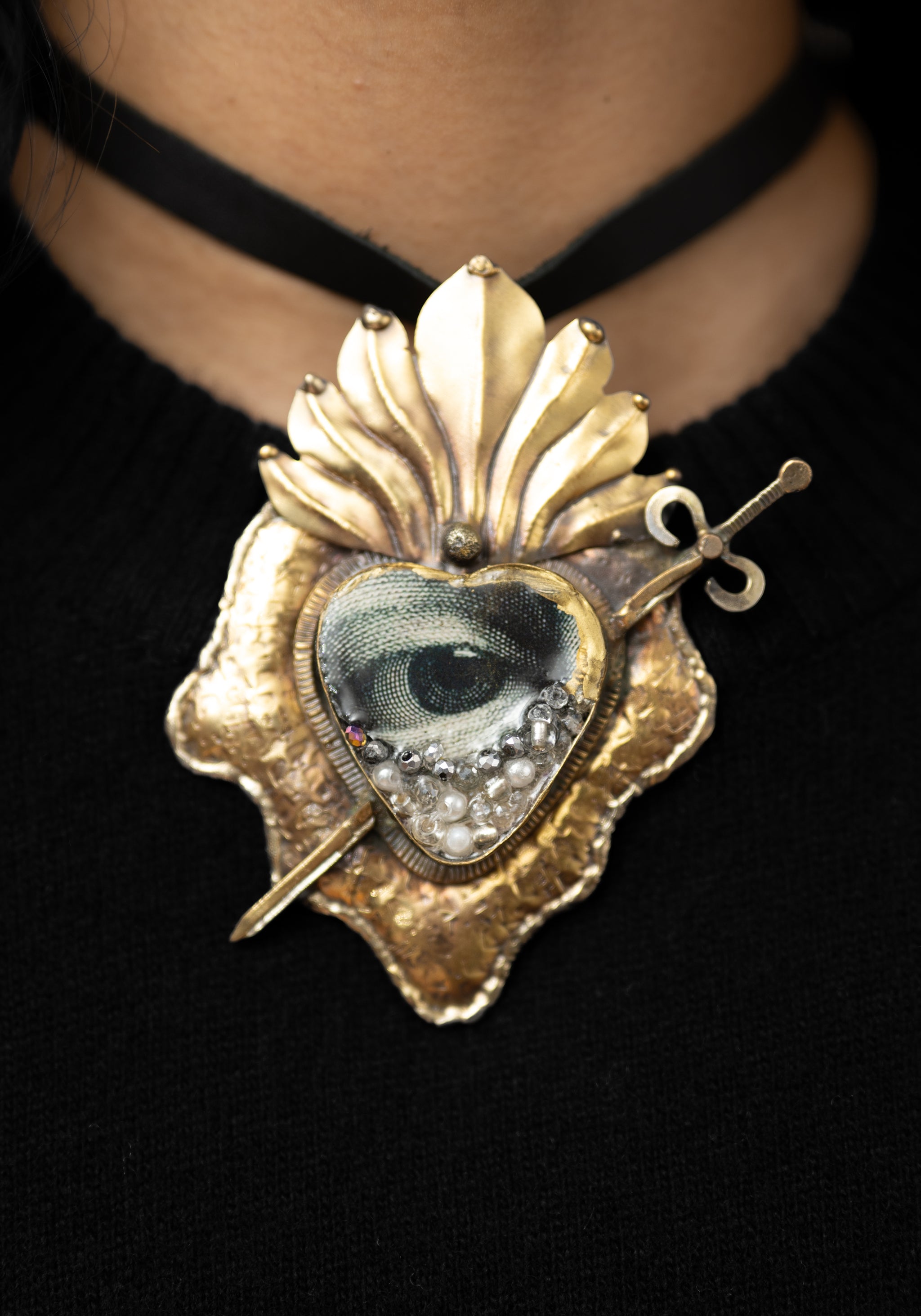 The Encrusted Heart, Sword and Eye Necklace from Mexico-based Tita Lopez is designed for those who embrace bold, meaningful jewelry. It can be worn solo as a striking focal point or layered with other necklaces to create a rich, textured look that balances edgy craftsmanship with contemporary artistry, adding effortless character and elevated style to both casual and refined outfits.