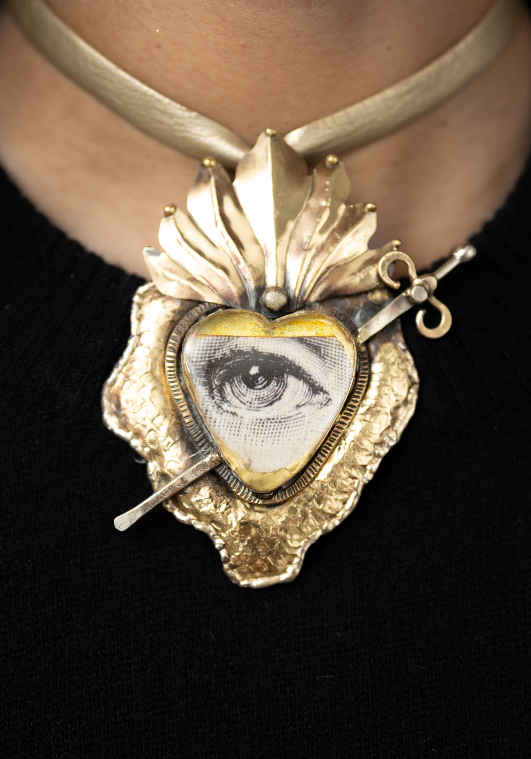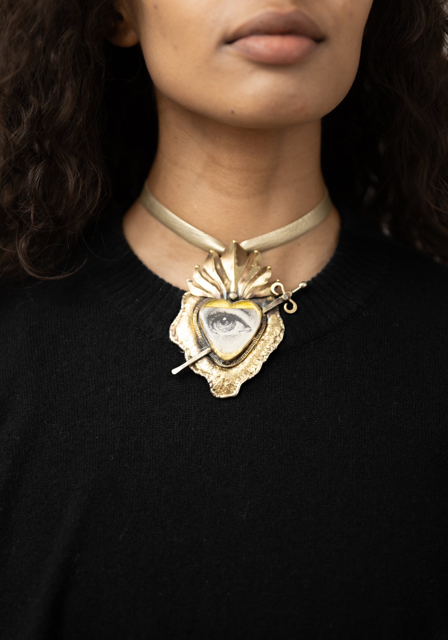 The Gilded Detail Heart, Sword and Eye Necklace from Mexico-based Tita Lopez is crafted in German silver and leather, featuring gilded accents on the heart, sword, and eye motifs. Made for those who seek statement jewelry with symbolic depth, it can be worn alone as a bold centerpiece or layered with other necklaces to add texture, color, and a bohemian edge.