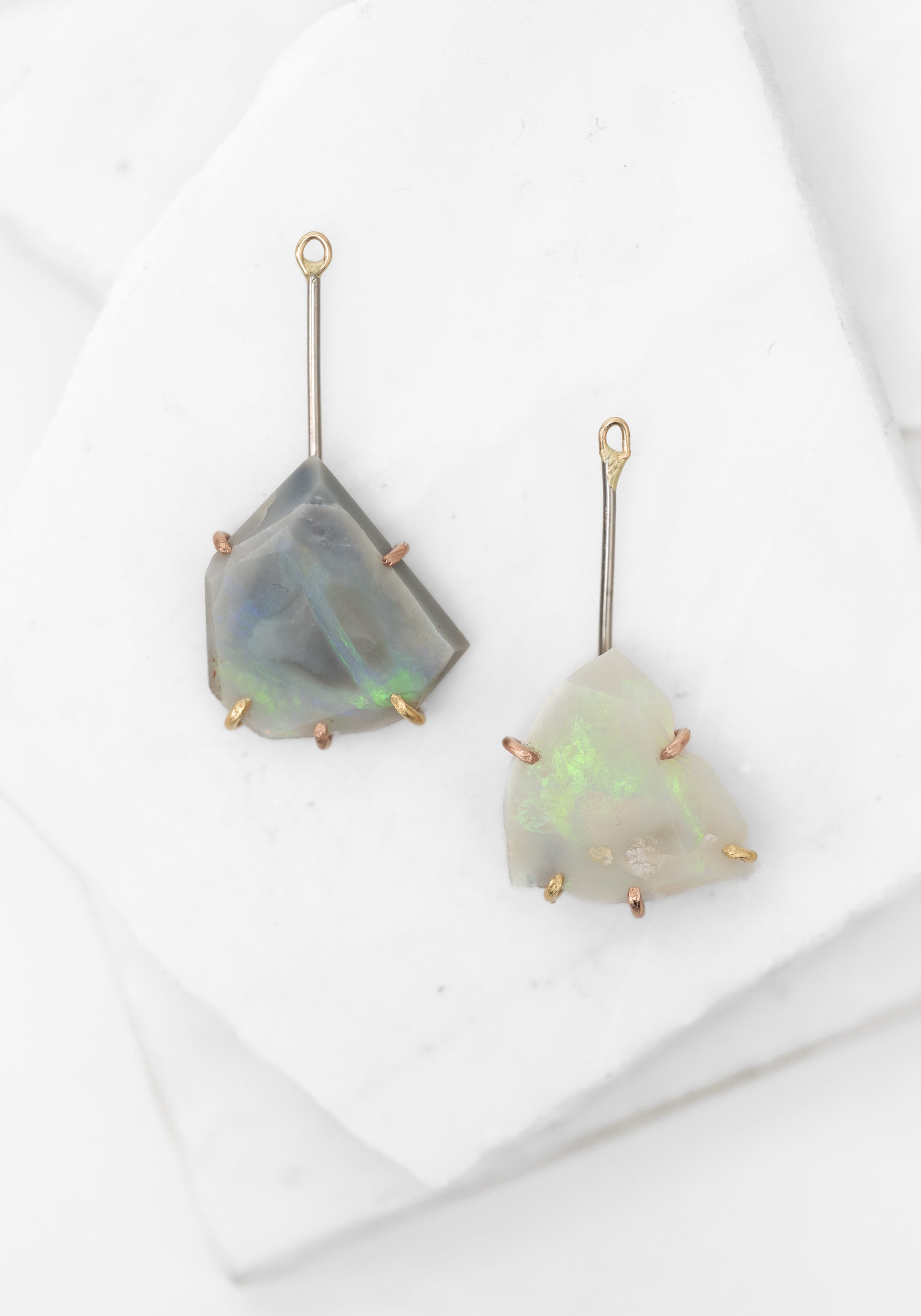 These gold australian opal drop attachments are intended to be paired with studs or hook earrings from the same maker. Pictured with Variance Objects hook earrings.