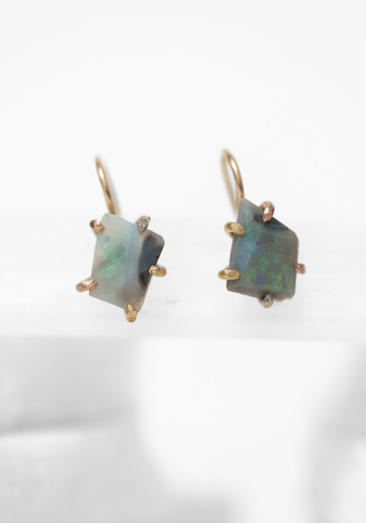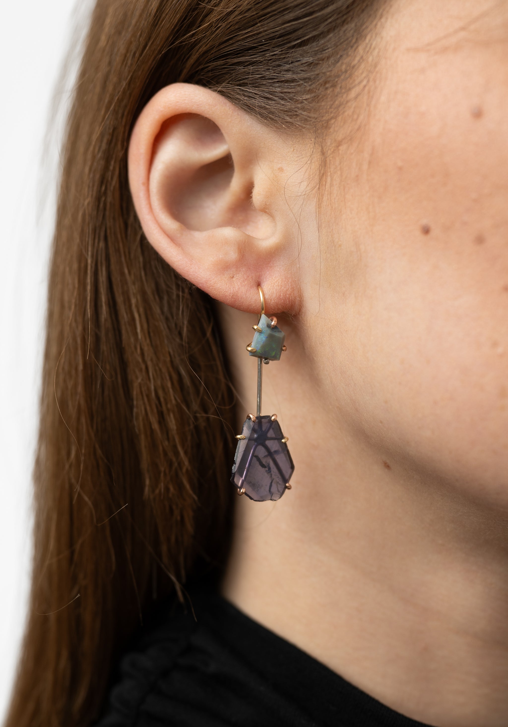 These gold Australian opal hook earrings can be worn alone or paired with drop attachments from the same maker. Pictured with Variance Objects drop attachments.