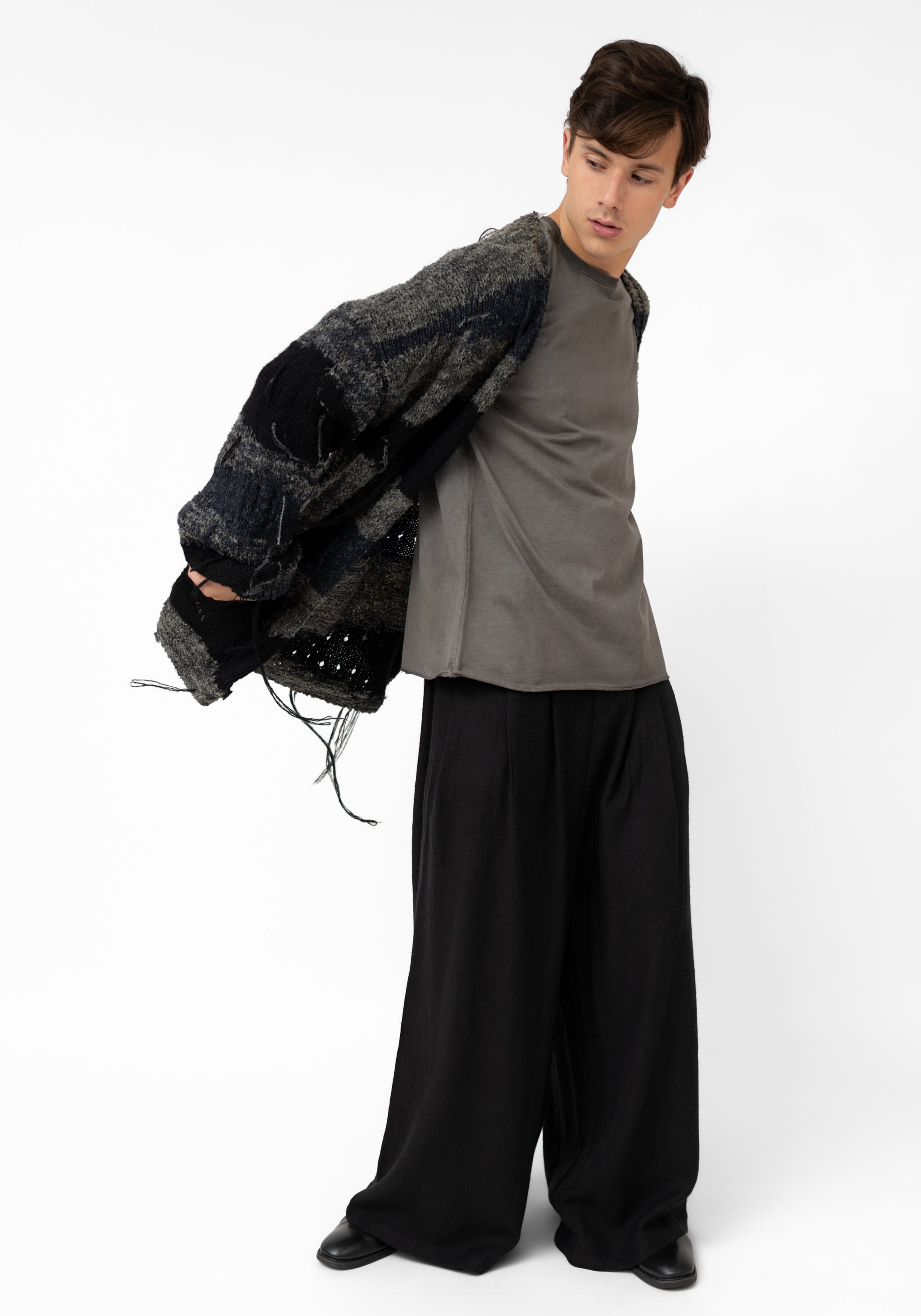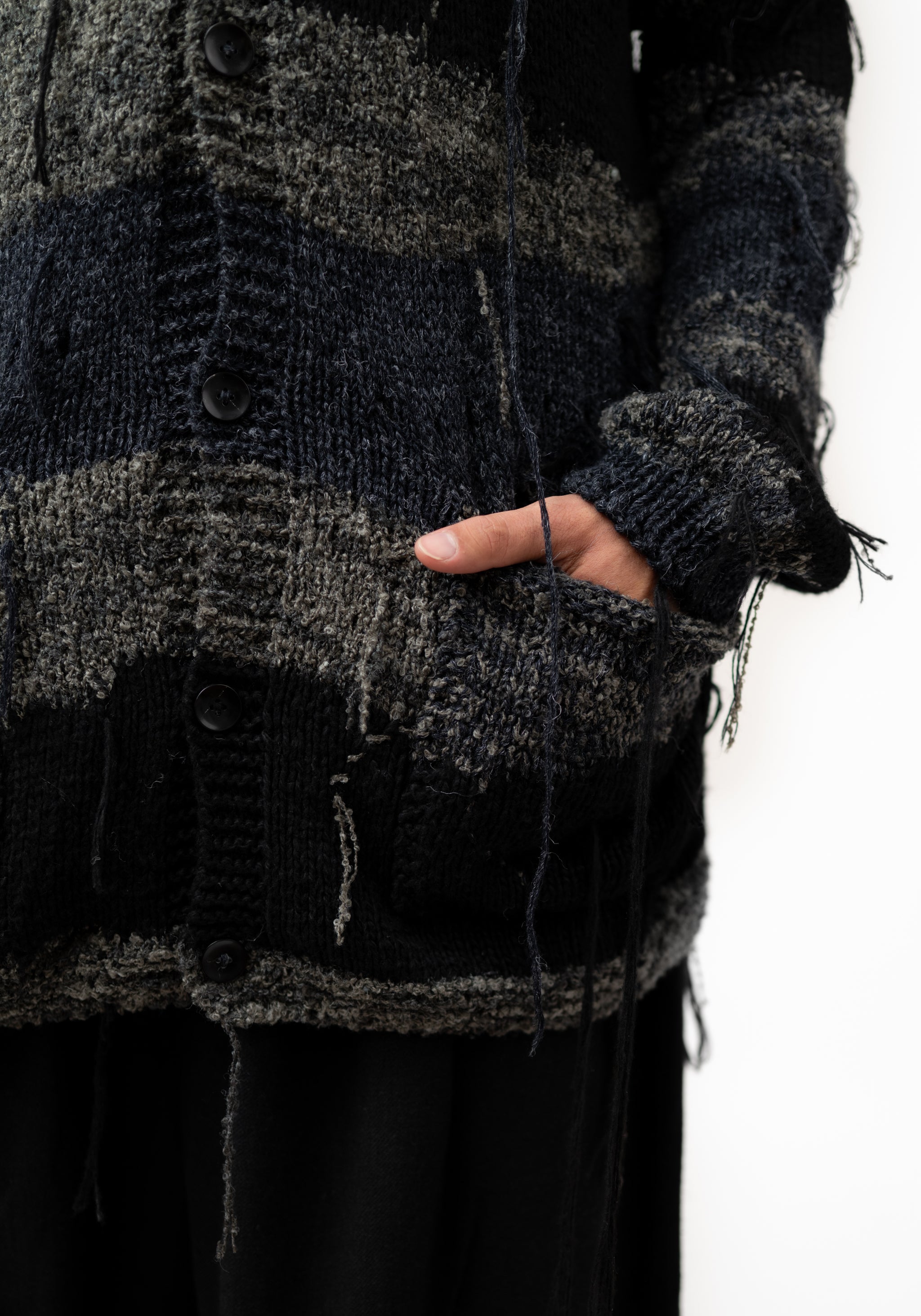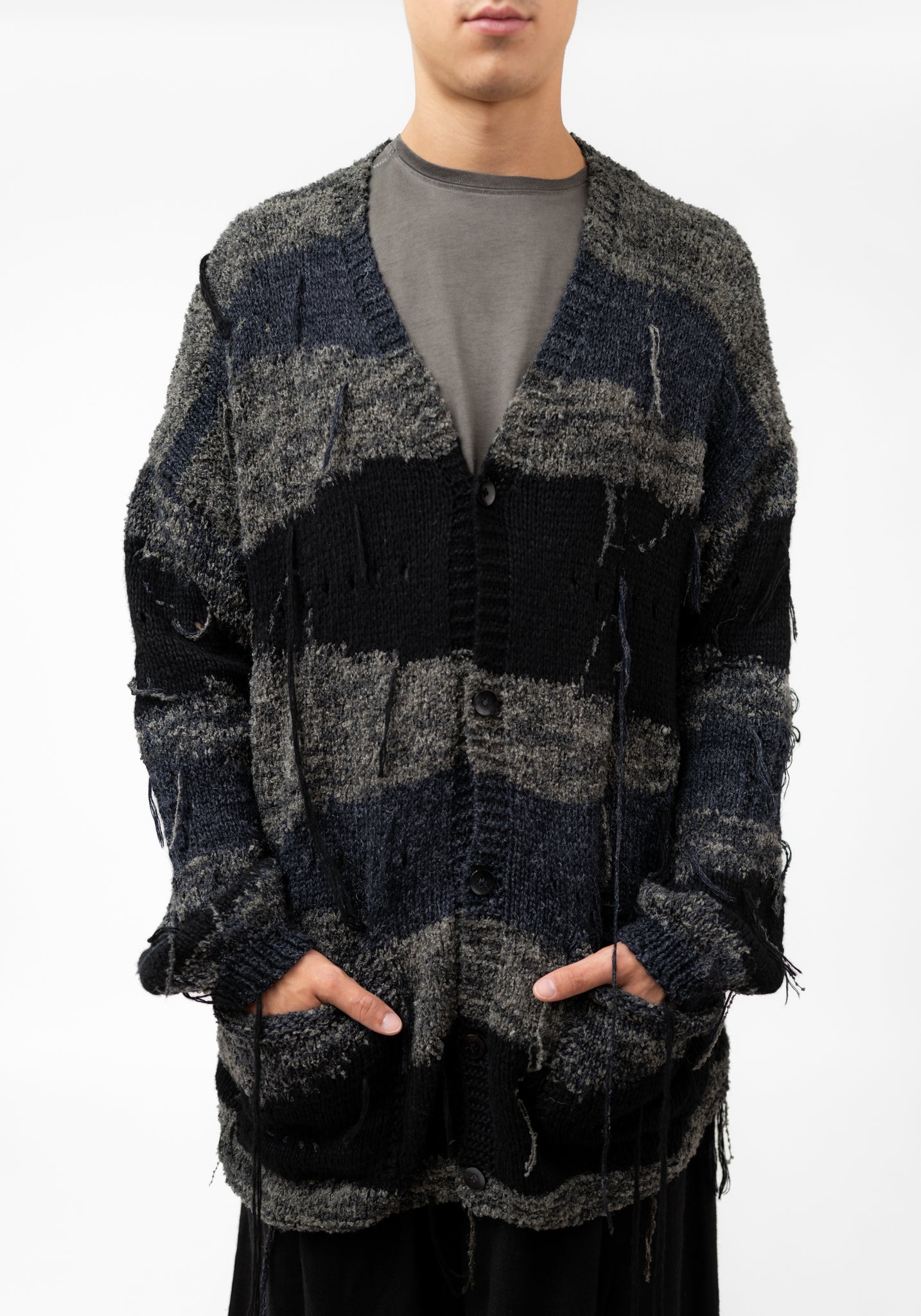 The Kyomu Oversized Striped Wool Blend Cardigan from Hong Kong-based voidstudio features textured knit, hanging yarn accents, and front patch pockets for layered, tactile depth. Ribbed trim throughout adds subtle structure to its voluminous silhouette. An ideal statement piece for elevated city outings or creative evening affairs, layer it over a fitted top with wide-leg pants to showcase its sculptural texture and thoughtful craftsmanship.