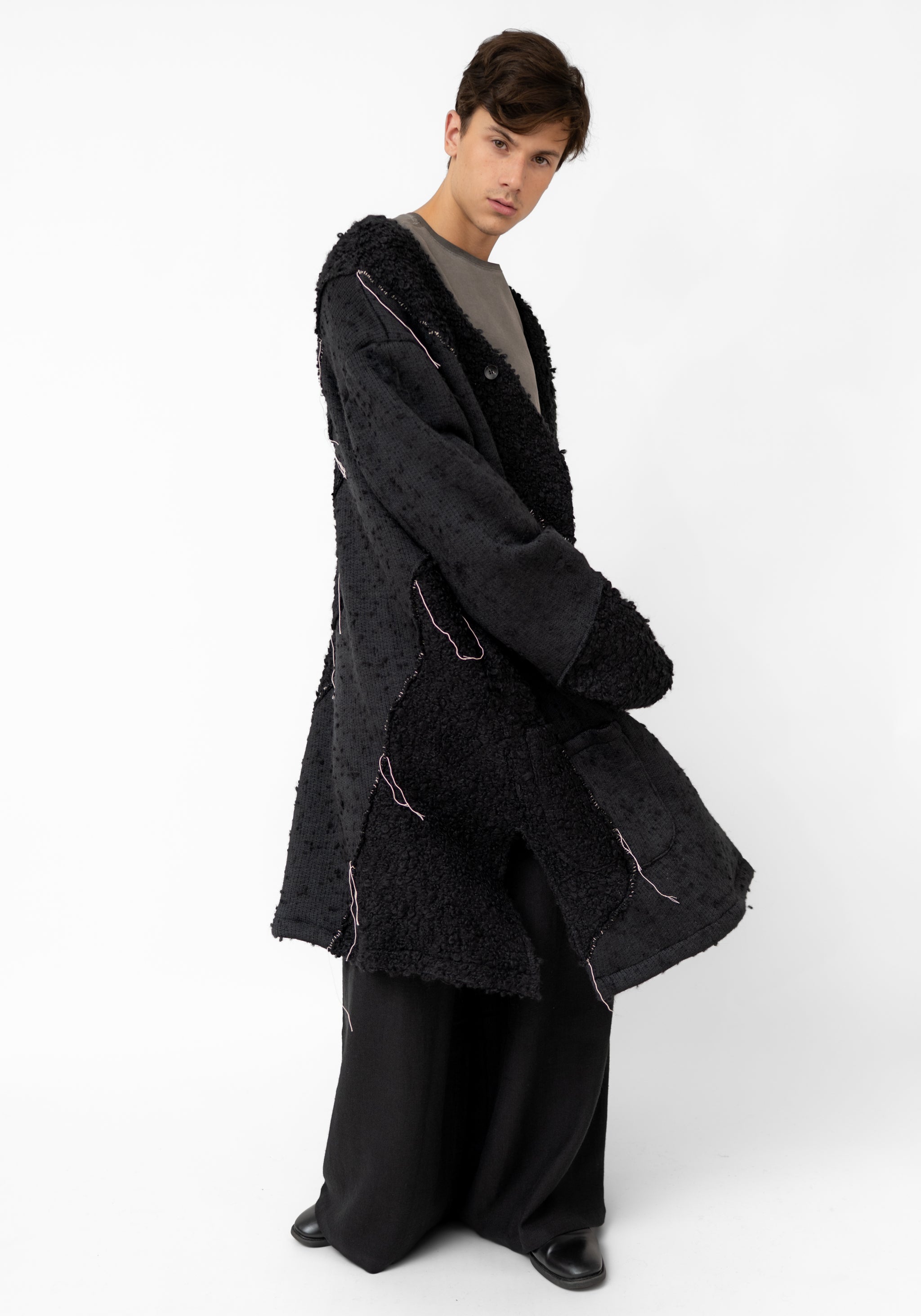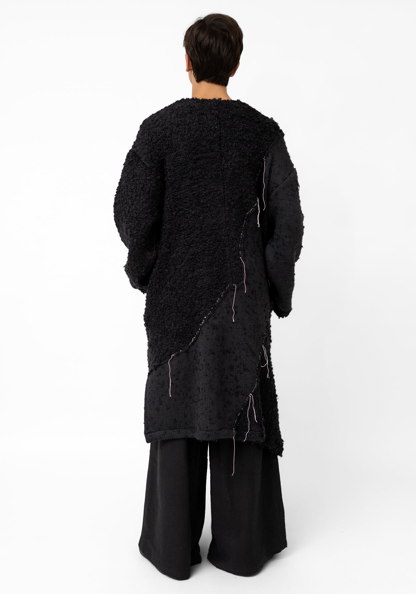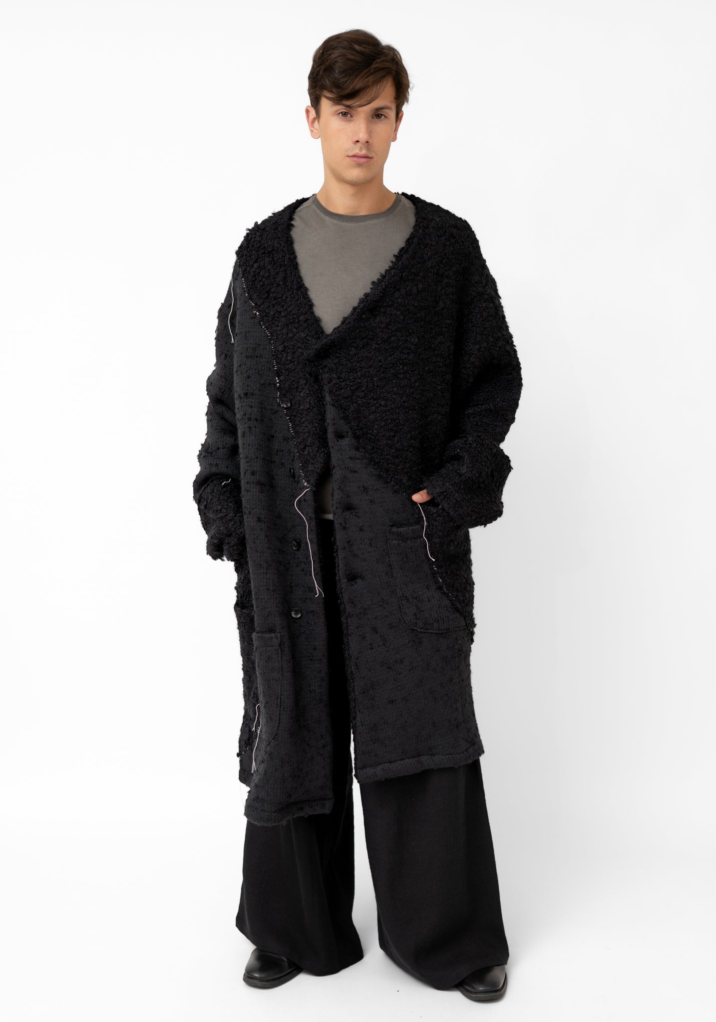 The Shiro Textured Wool Blend Maxi Cardigan from Hong Kong-based voidstudio is made for those who appreciate sculptural, textured silhouettes with artistic flair. Knit panels, contrast stitching, and side slits create fluid movement and layered dimension. Ideal for city outings or creative gatherings, layer over a fitted top and wide-leg pants to highlight its architectural lines and refined craftsmanship.