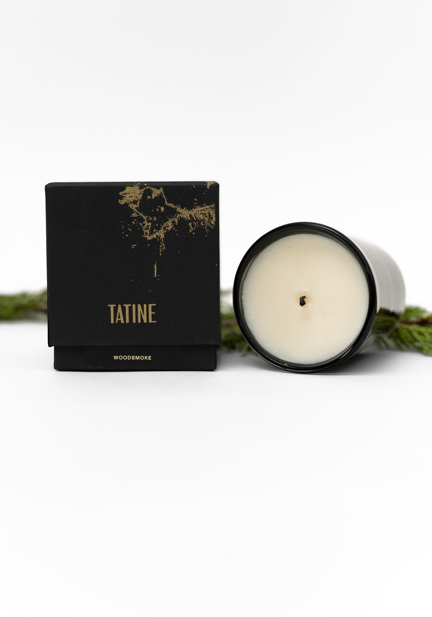 Tatine Woodsmoke Candle: A woodpile bouquet melting and burning in the glow of a crackling, ambient flame. Notes of Cedarwood + Fir Balsam, Clove Oil, Smoldering Embers, Campfire Smoke.