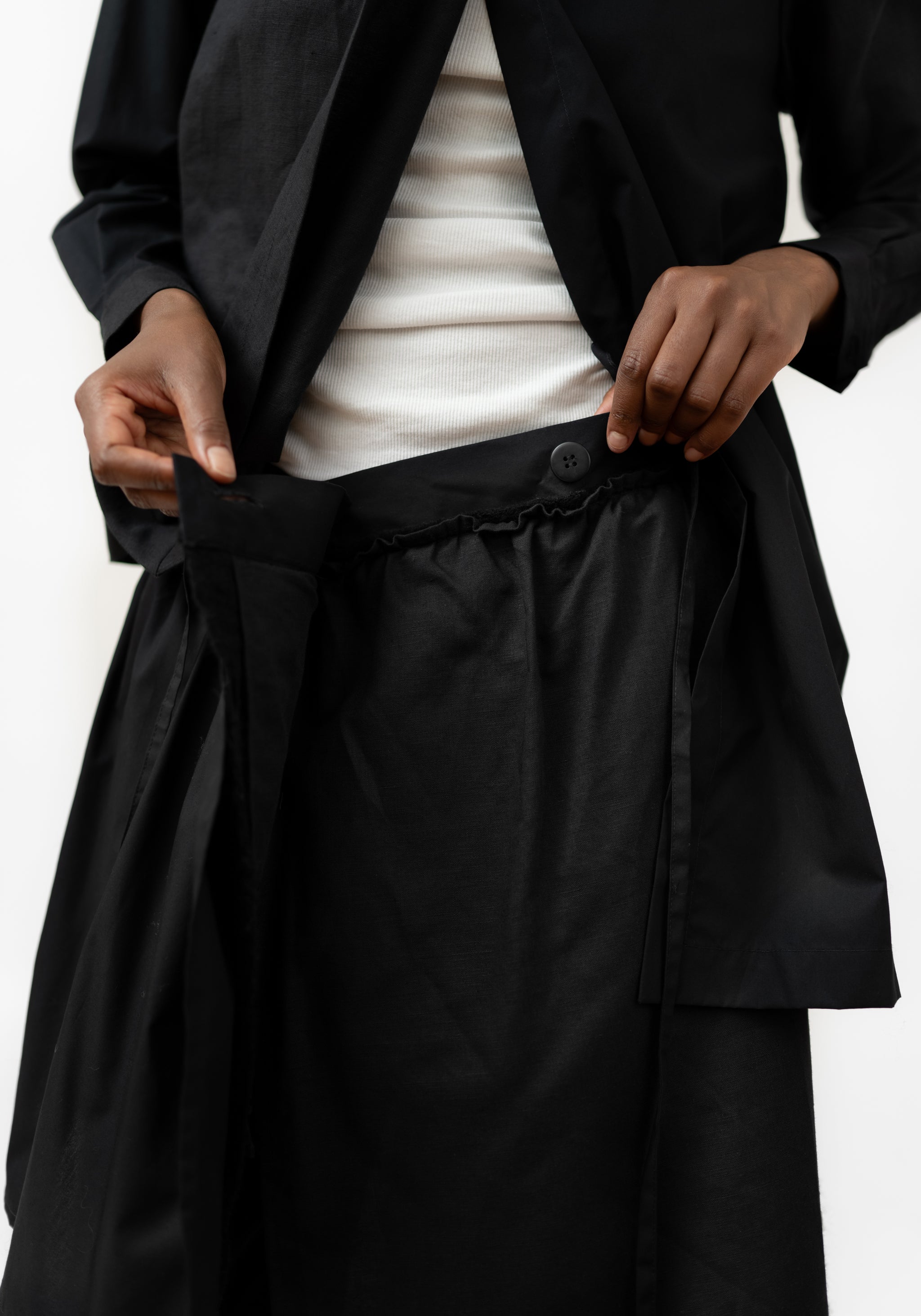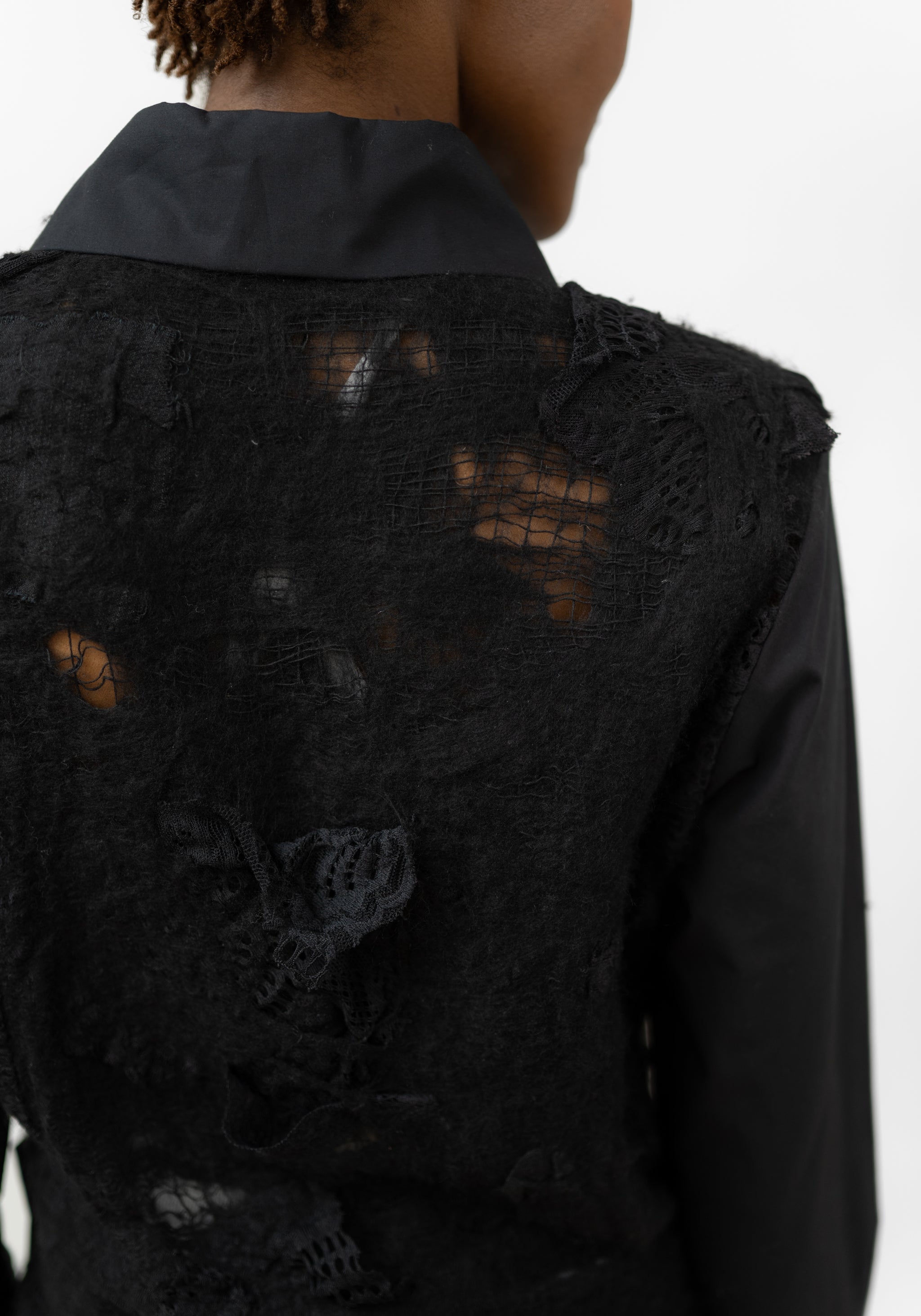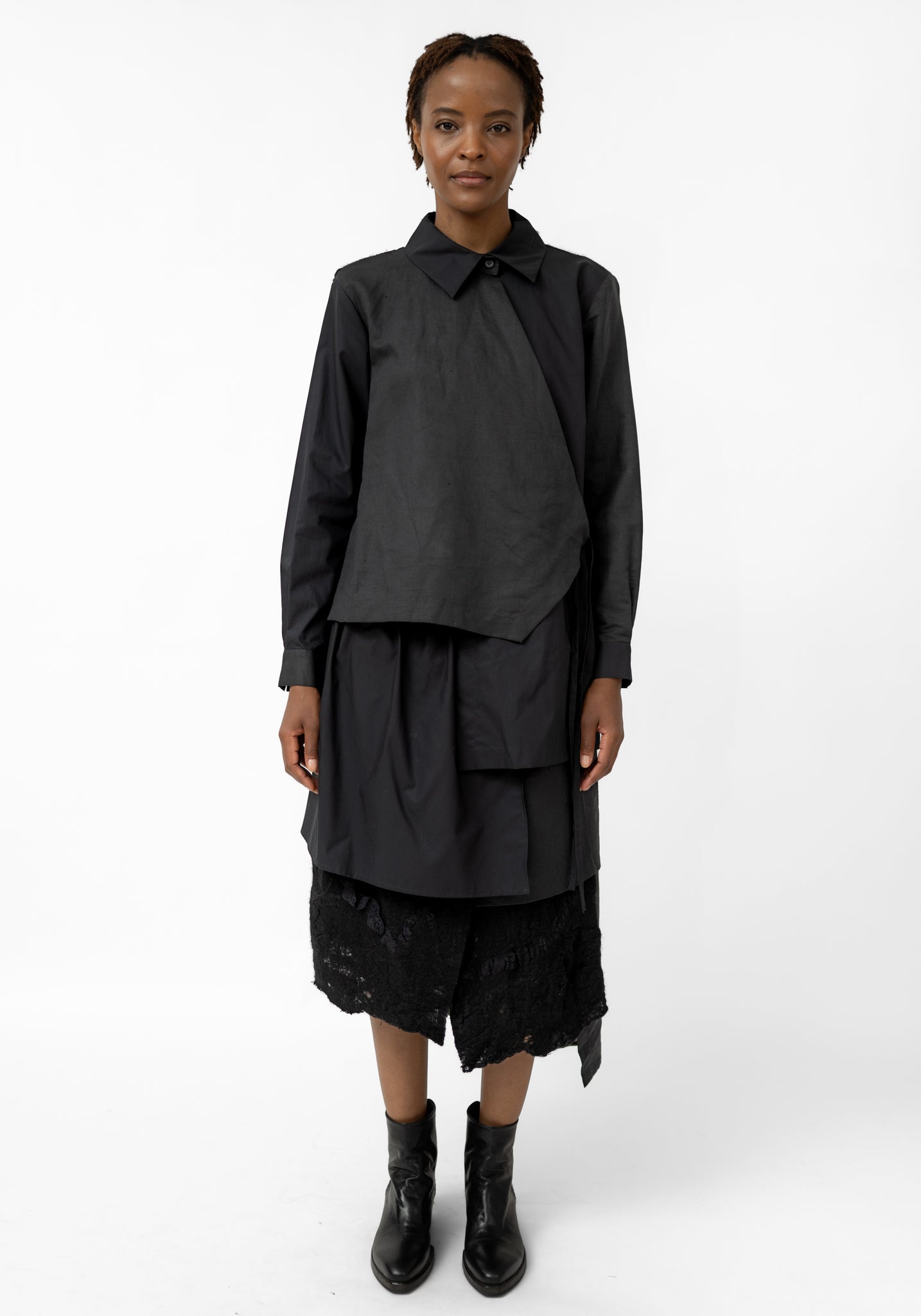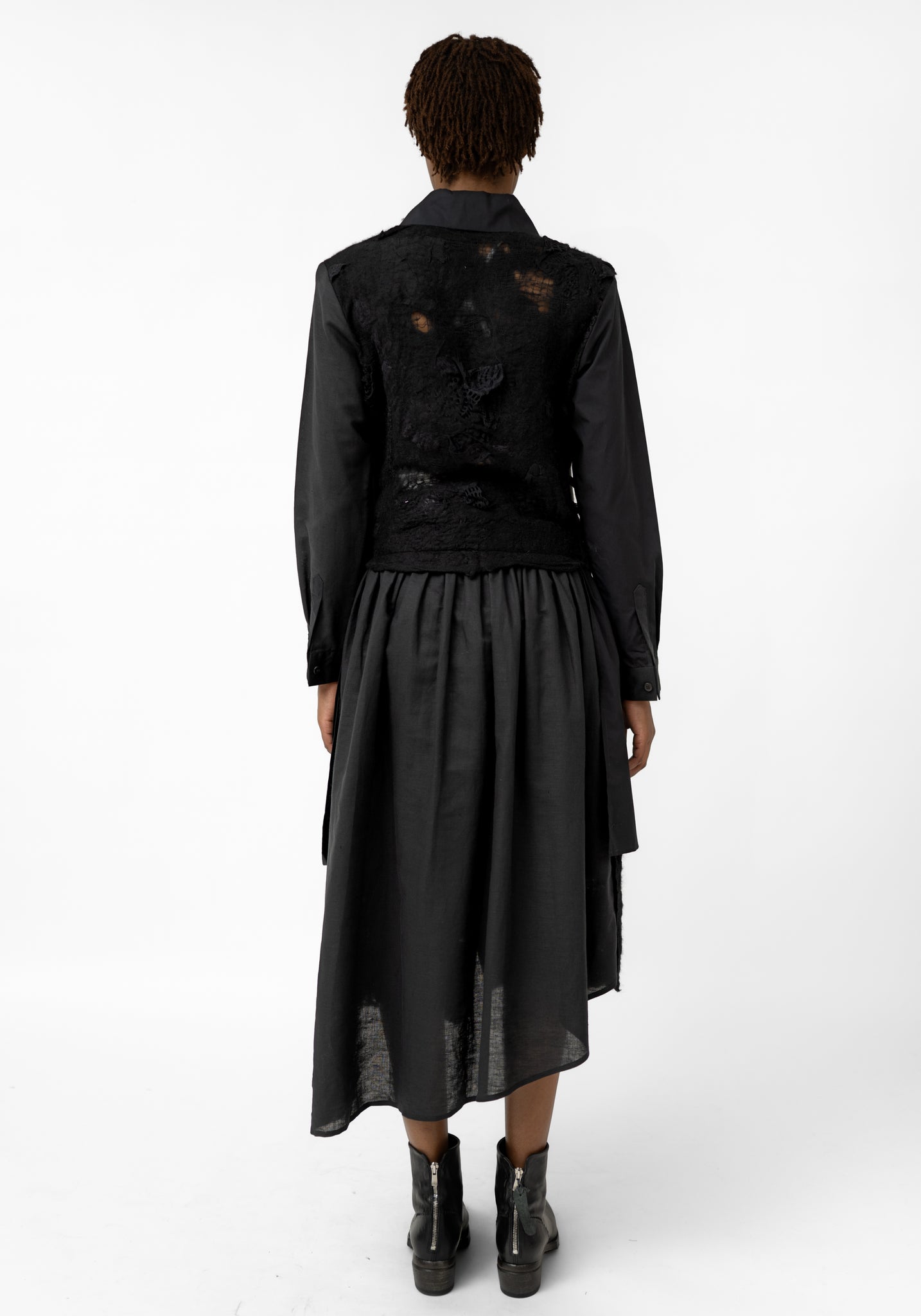 The Felted Wool and Cotton Layered Shirt Dress from Hong Kong-based YEUNG CHIN is designed for those who embrace unique, avant-garde style. The layered felted panels, open-weave lace inlays, and draped front skirt add dimension and sculptural movement. Ideal for statement-making everyday wear or striking evening looks, it can be paired with a flowing skirt or wide-leg pants to highlight the asymmetric handkerchief hem.